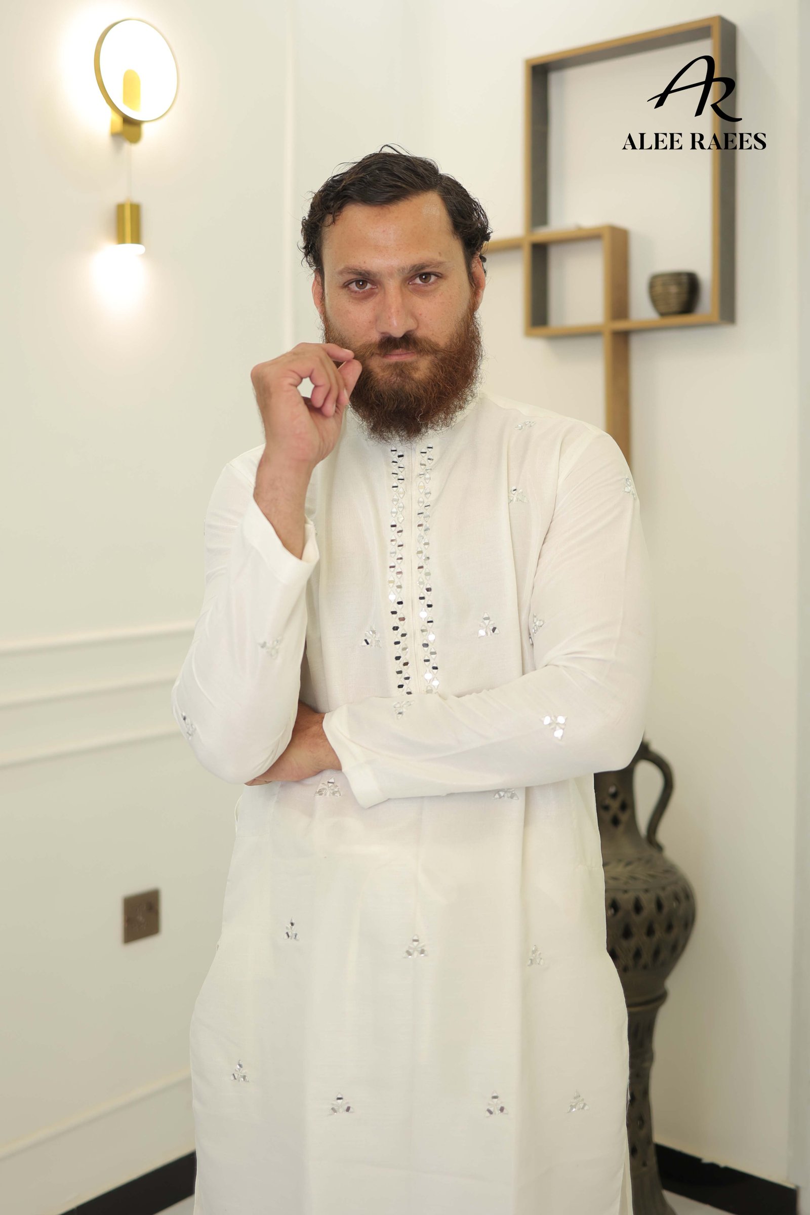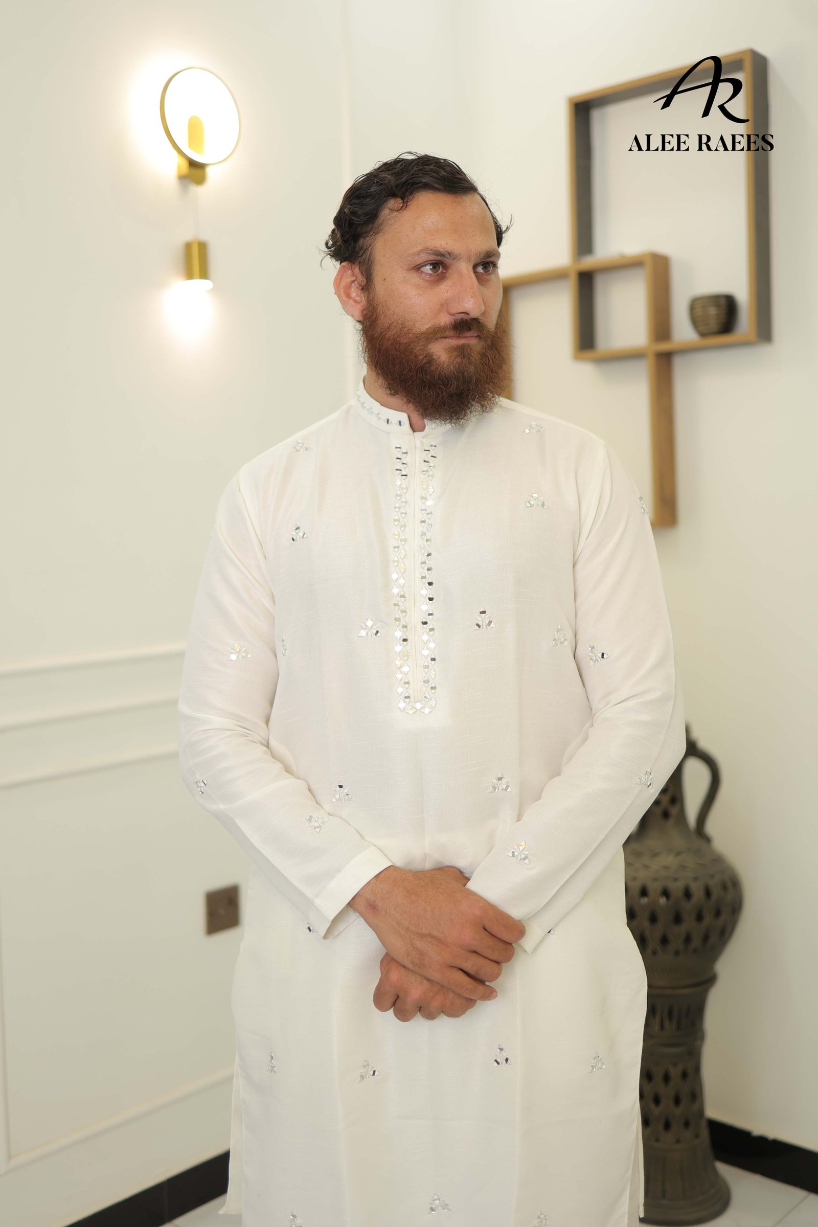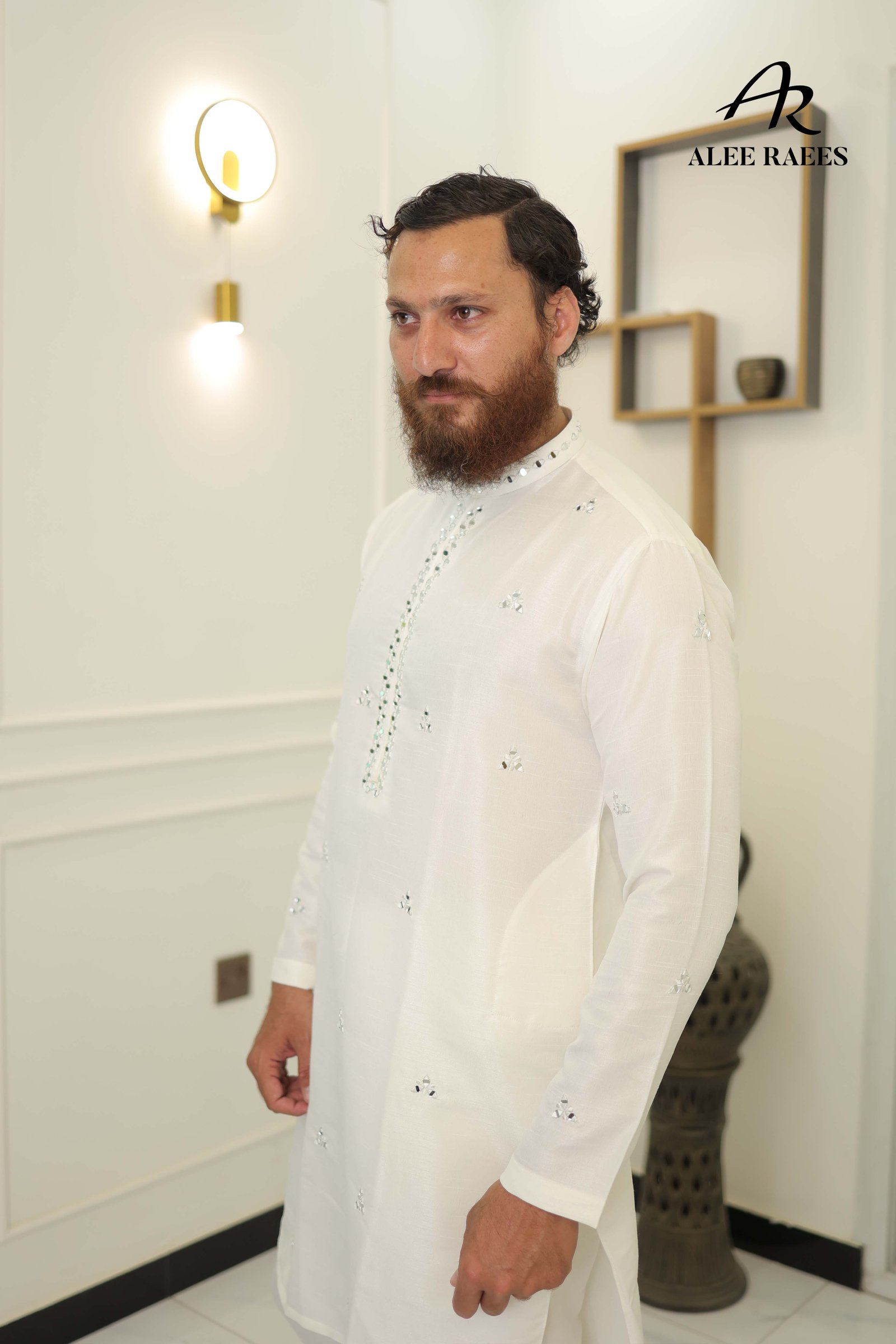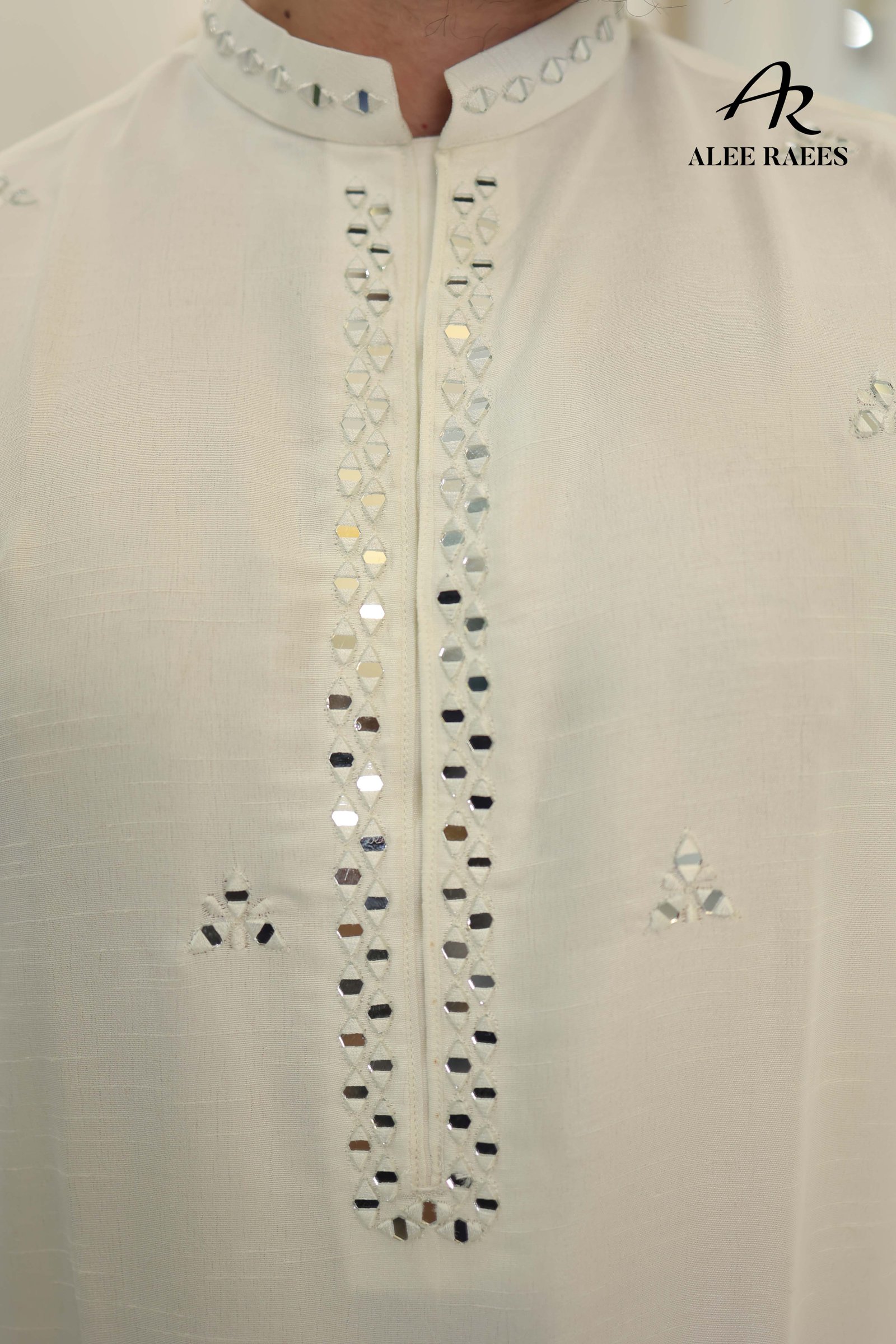 Command attention in this sleek and powerful white shalwar kameez, featuring meticulously hand-embroidered mirror work on the neckline and collar. Crafted from premium-quality fabric with a subtle sheen, this outfit is the epitome of modern-day festive elegance.