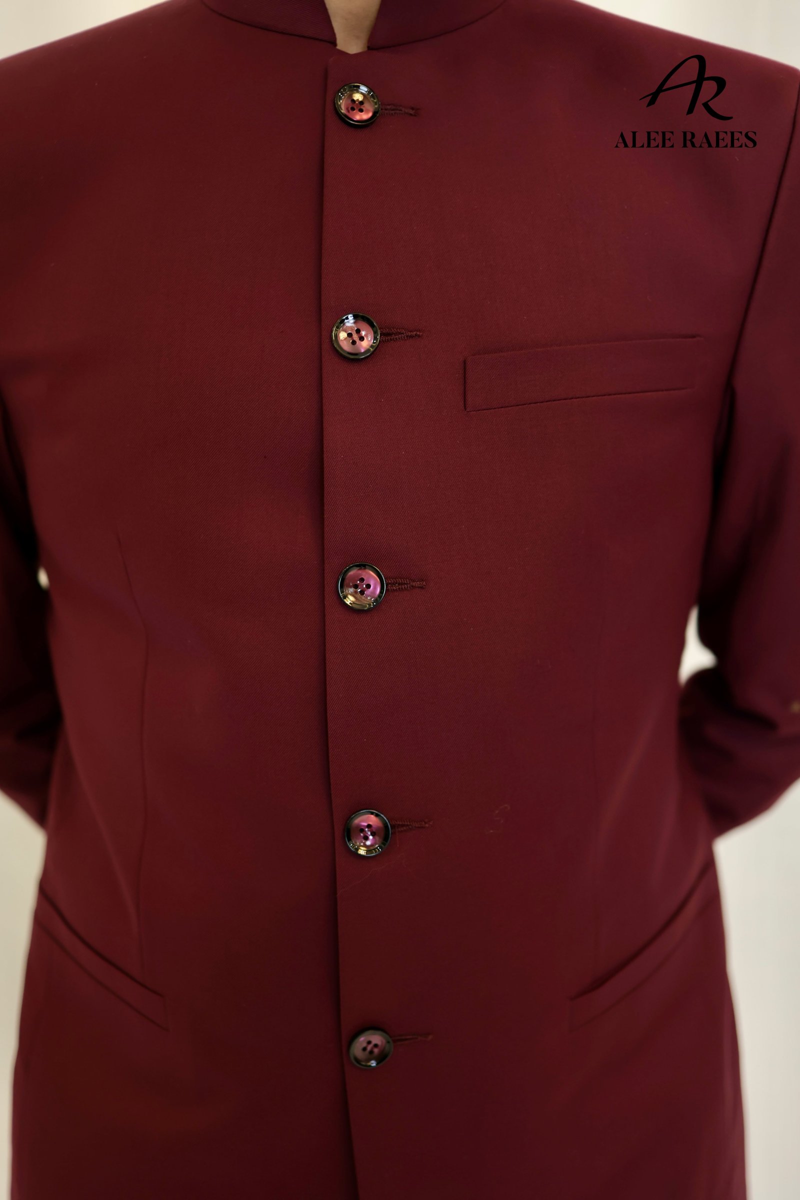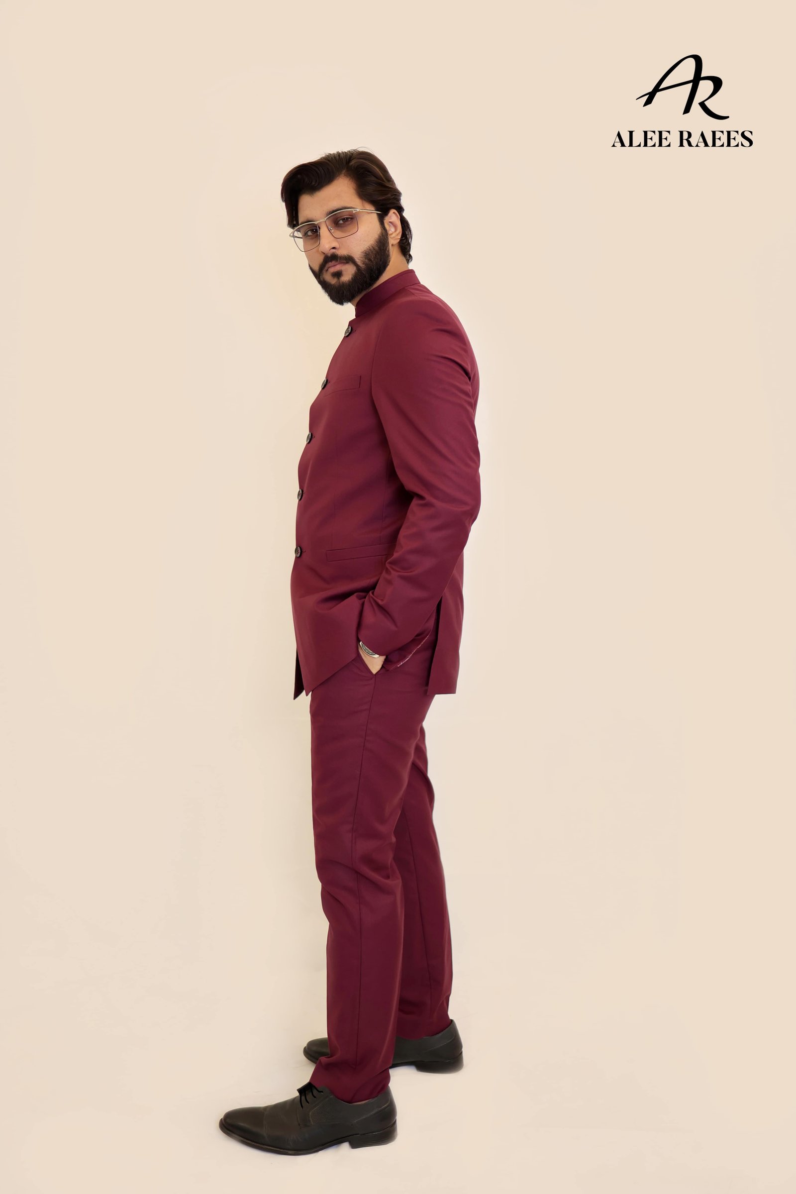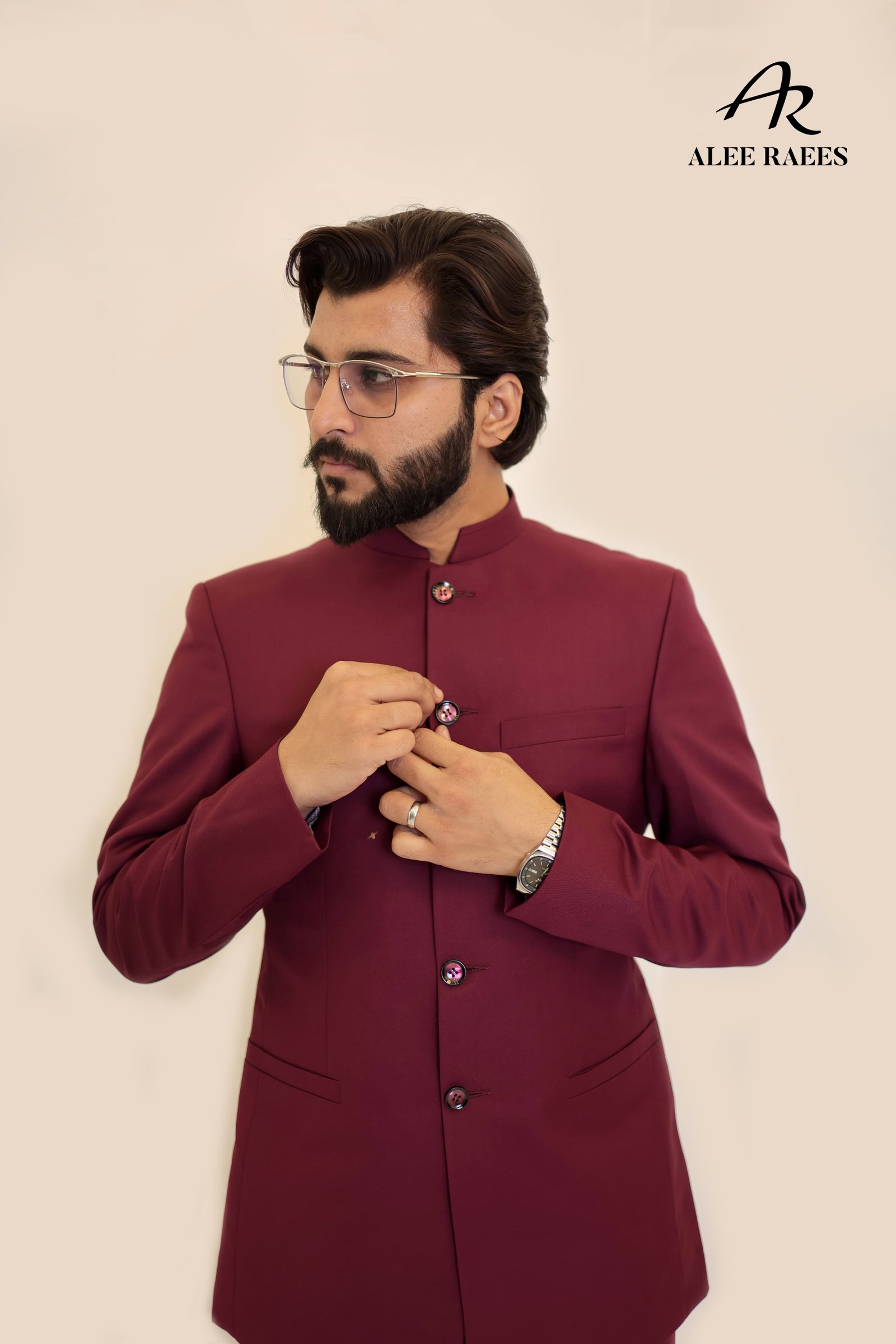 Command attention in the Maroon Royale Prince Coat by ALEE RAEES. This coat features a structured, slim-fit silhouette and a classic band collar. Crafted from premium suiting fabric with a subtle lustrous finish, it offers exceptional comfort and refined elegance. The maroon-toned buttons seamlessly blend into the coat’s sleek design, while minimal welt pockets keep the look clean and modern.
