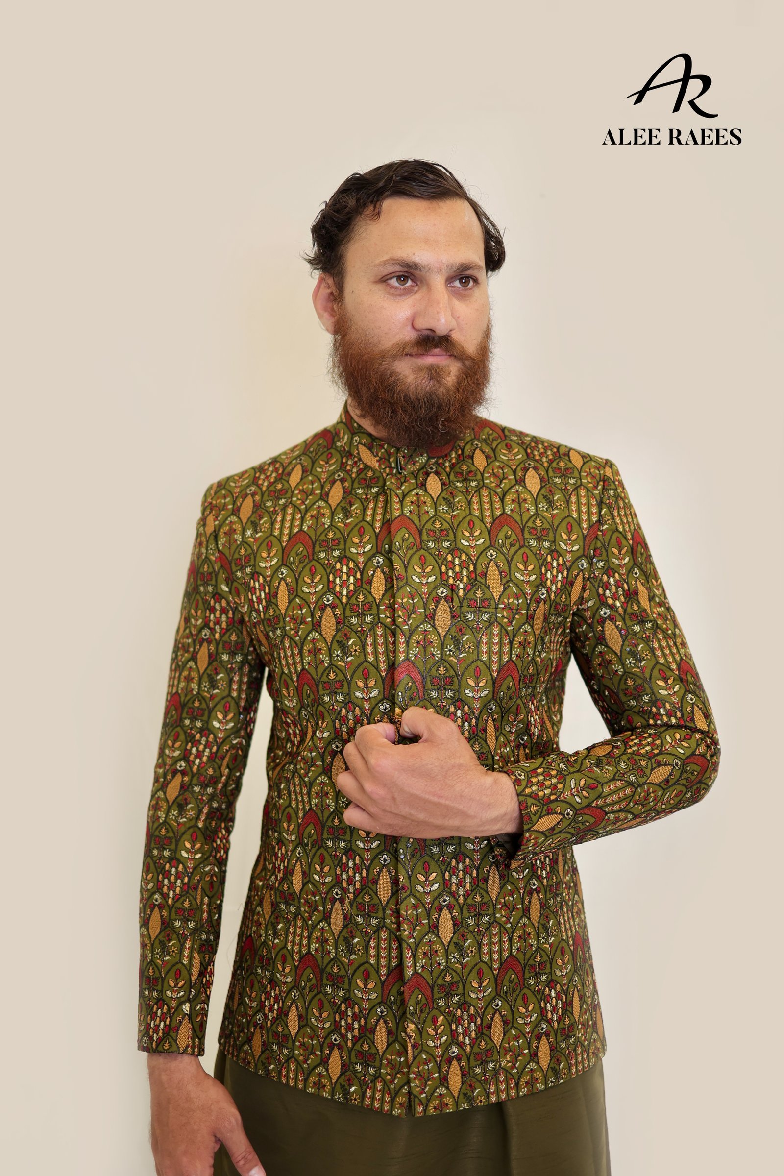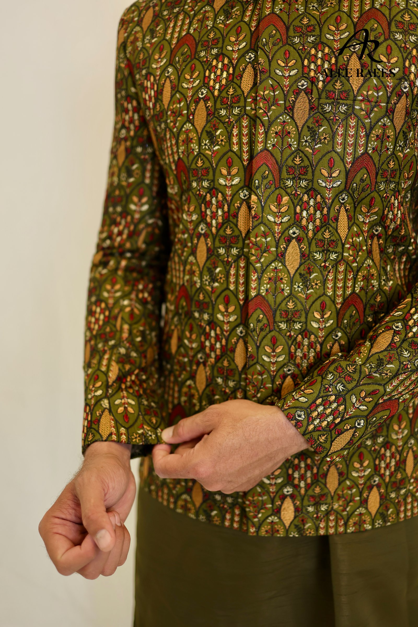 Make a striking entrance in the Verdant Tapestry ensemble by ALEE RAEES. This artisanal prince coat, woven in a rich olive-green jacquard with intricate botanical motifs, sits perfectly over a matching plain kurta and shalwar in a complementary deep olive hue. The tailored, slim-fit coat features a band collar, covered button placket, and side vents for ease of movement. Crafted from a premium silk-blend for subtle sheen and structure, this set is ideal for daytime wedding events, festive gatherings, or cultural soirées where you want to stand out with refined taste.