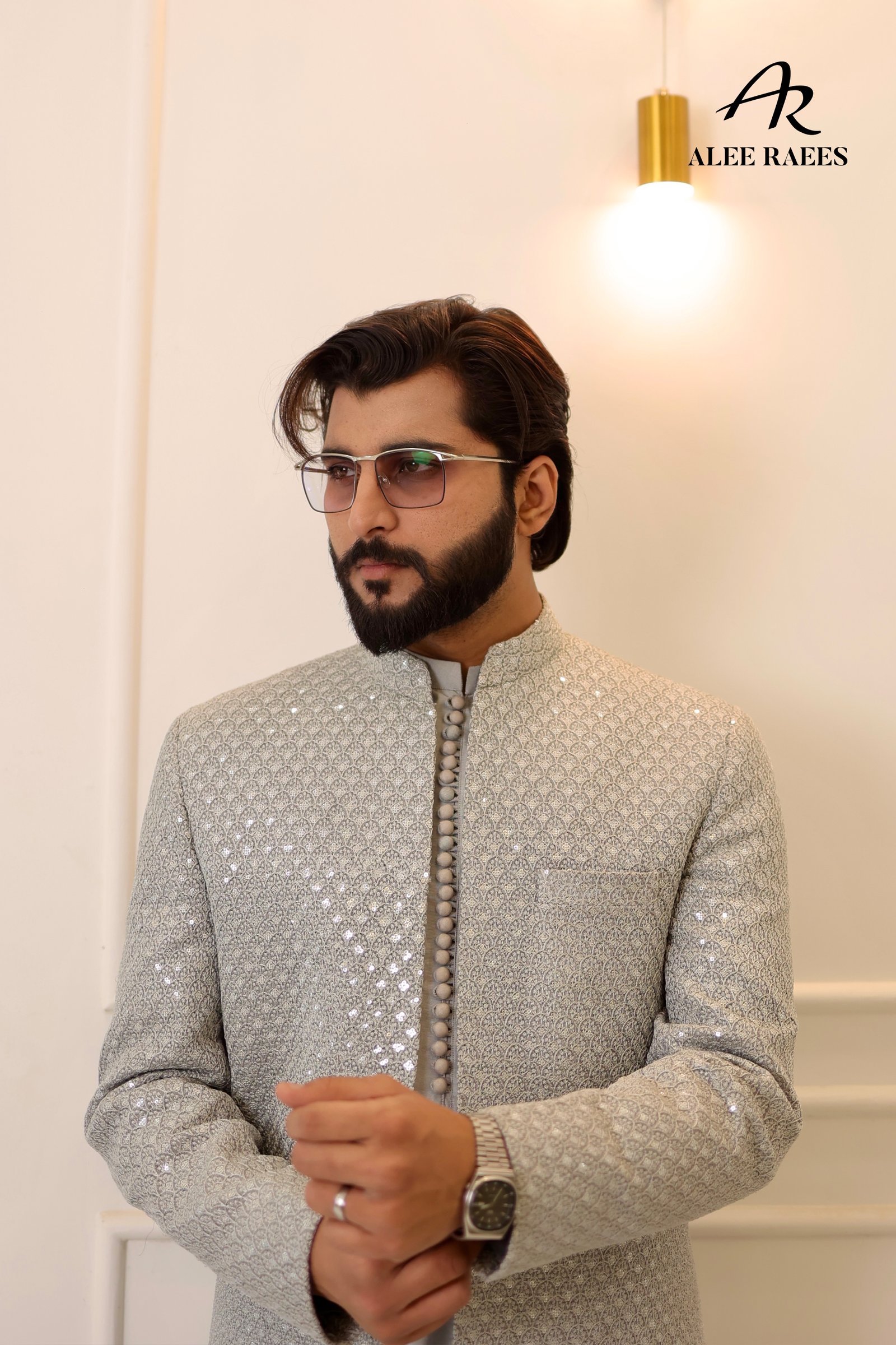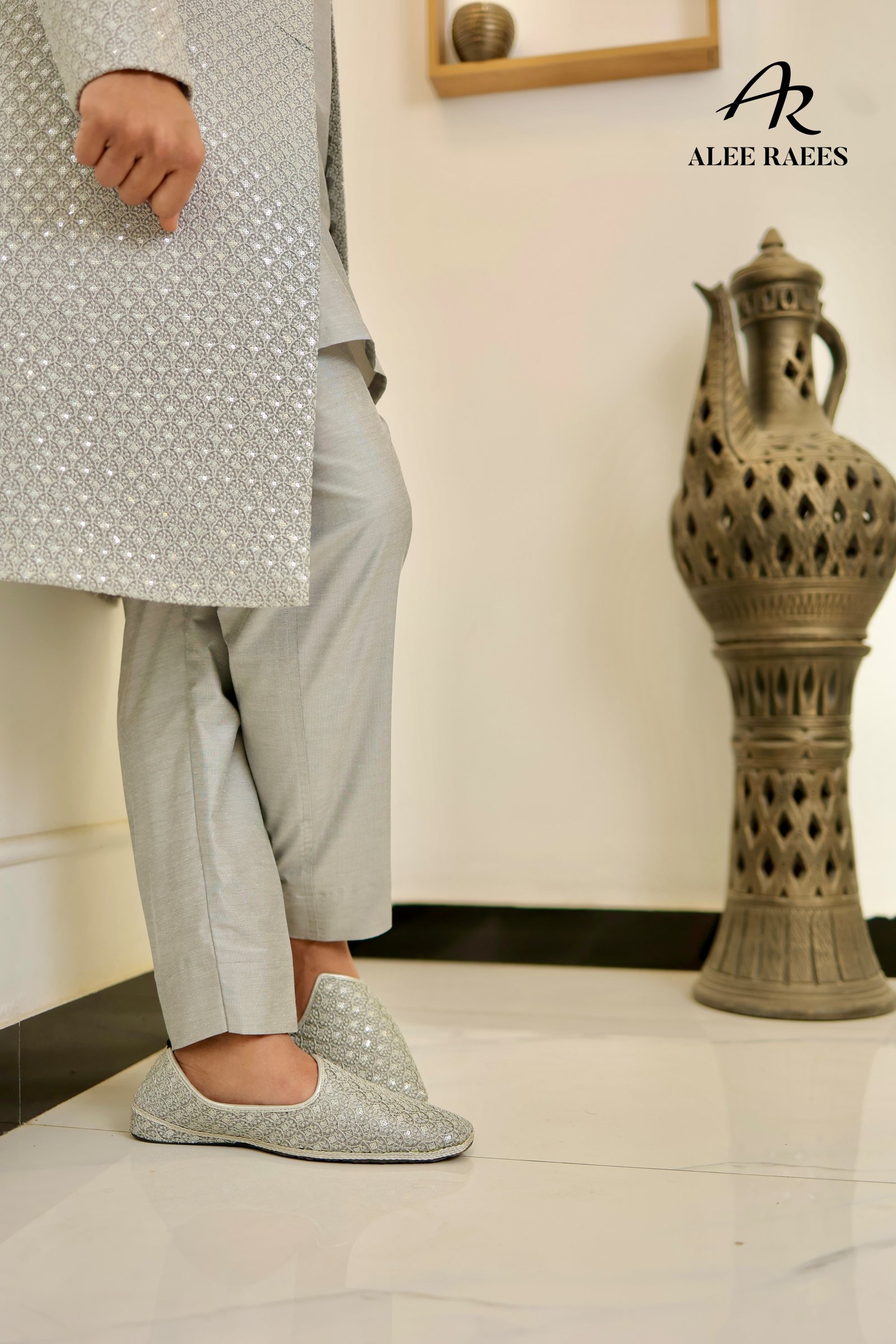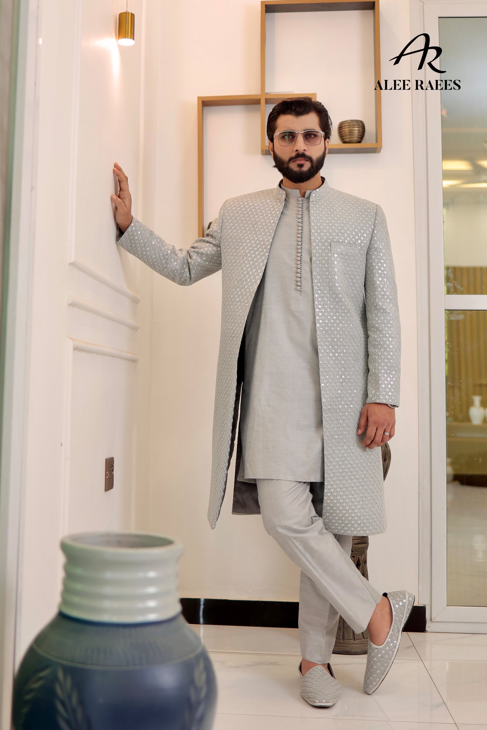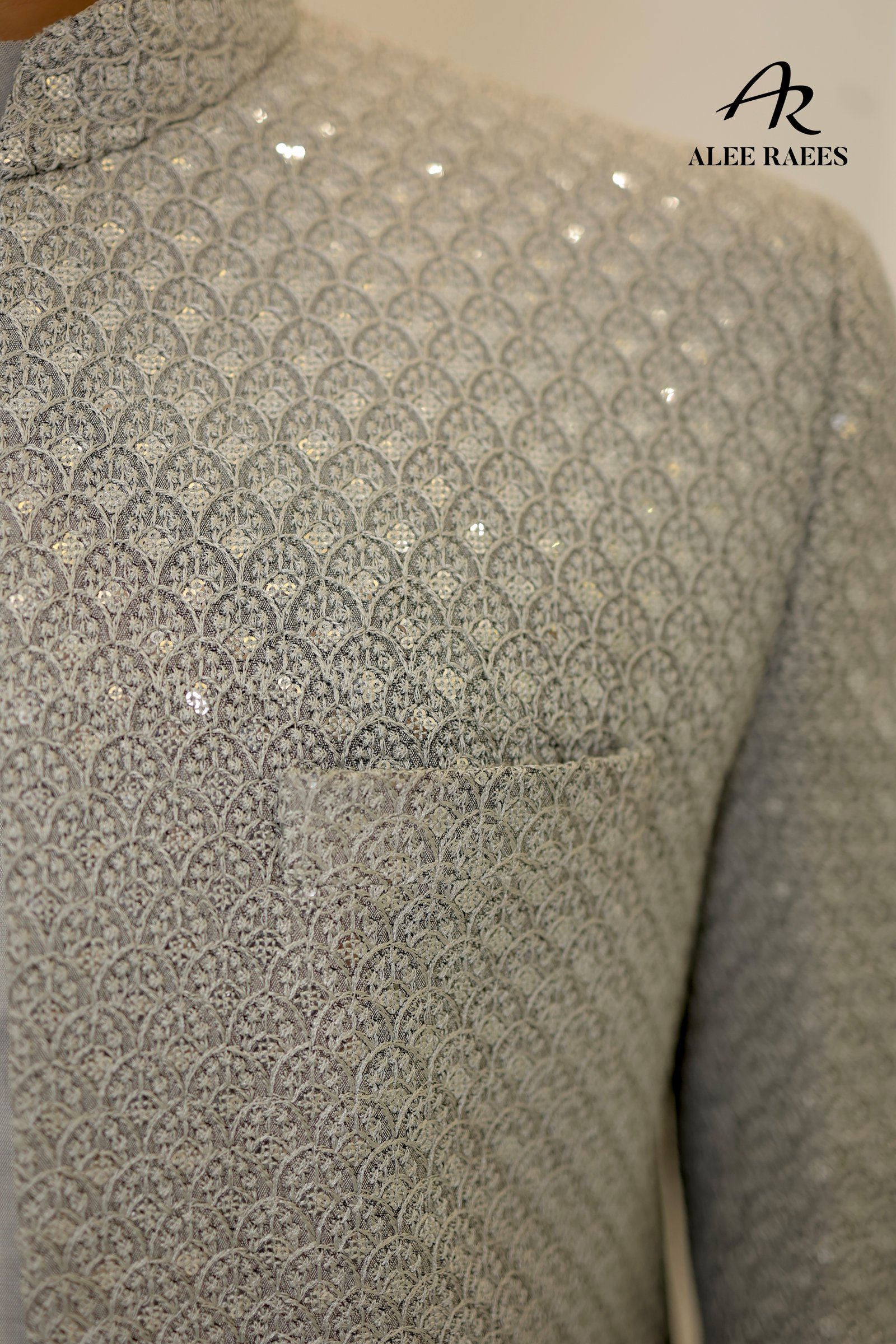 Illuminate every doorway in the Starlit Siren Sherwani Set by ALEE RAEES. This radiant ensemble features a long, tailored sherwani jacket richly embellished with tonal sequins in a geometric scallop pattern—each catch of light turning heads. Underneath, a coordinating silver-grey kurta and slim-fit trousers in a premium silk-blend fabric complete the look. The sherwani’s mandarin collar, concealed placket, and fabric-covered buttons keep the design sleek, while side vents ensure ease of movement. Perfect for evening festivities, reception entrances, or any occasion where you want to shine.