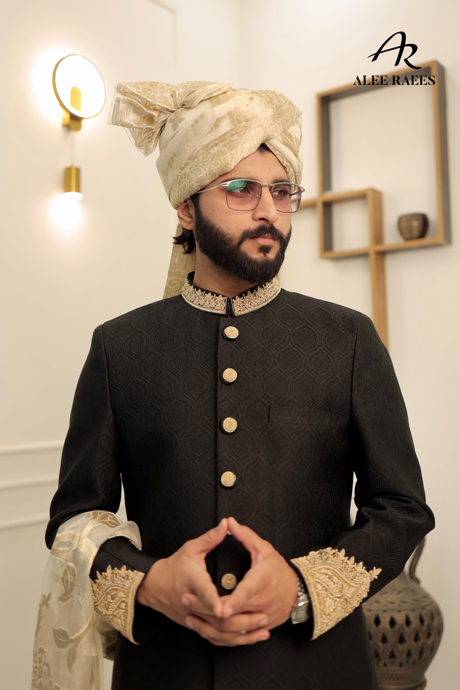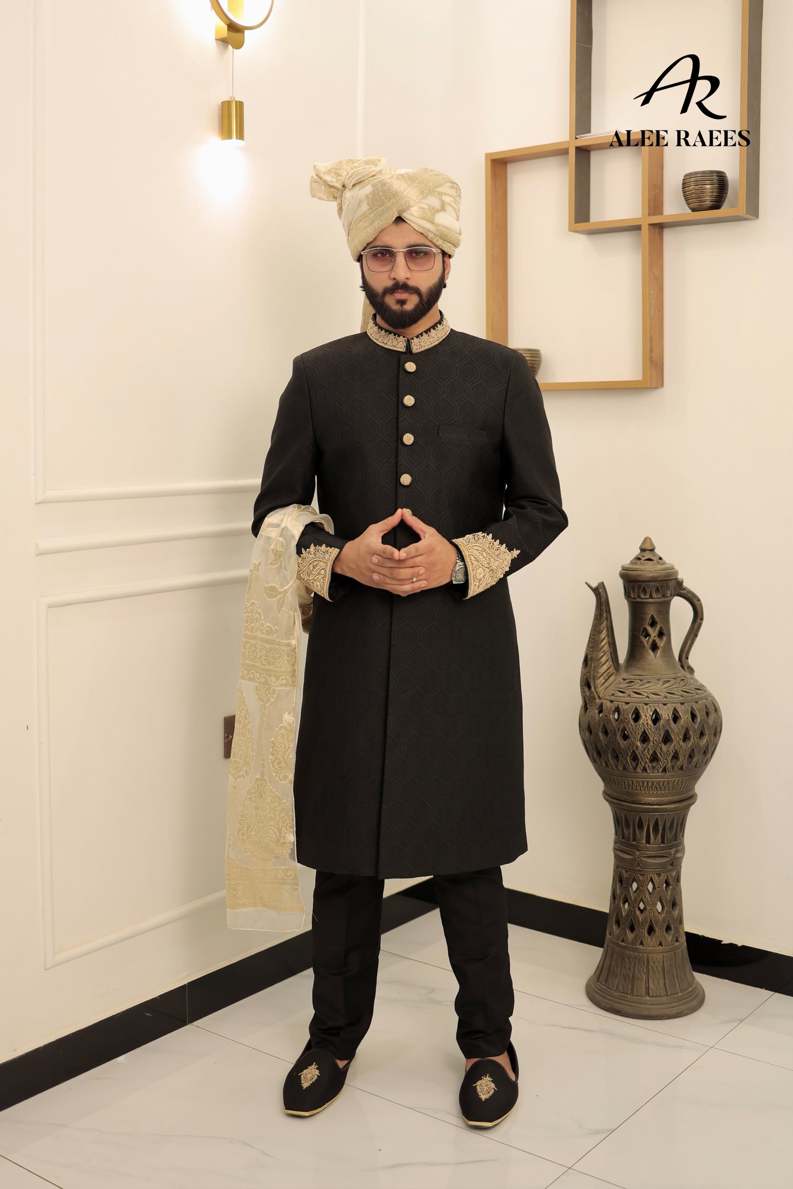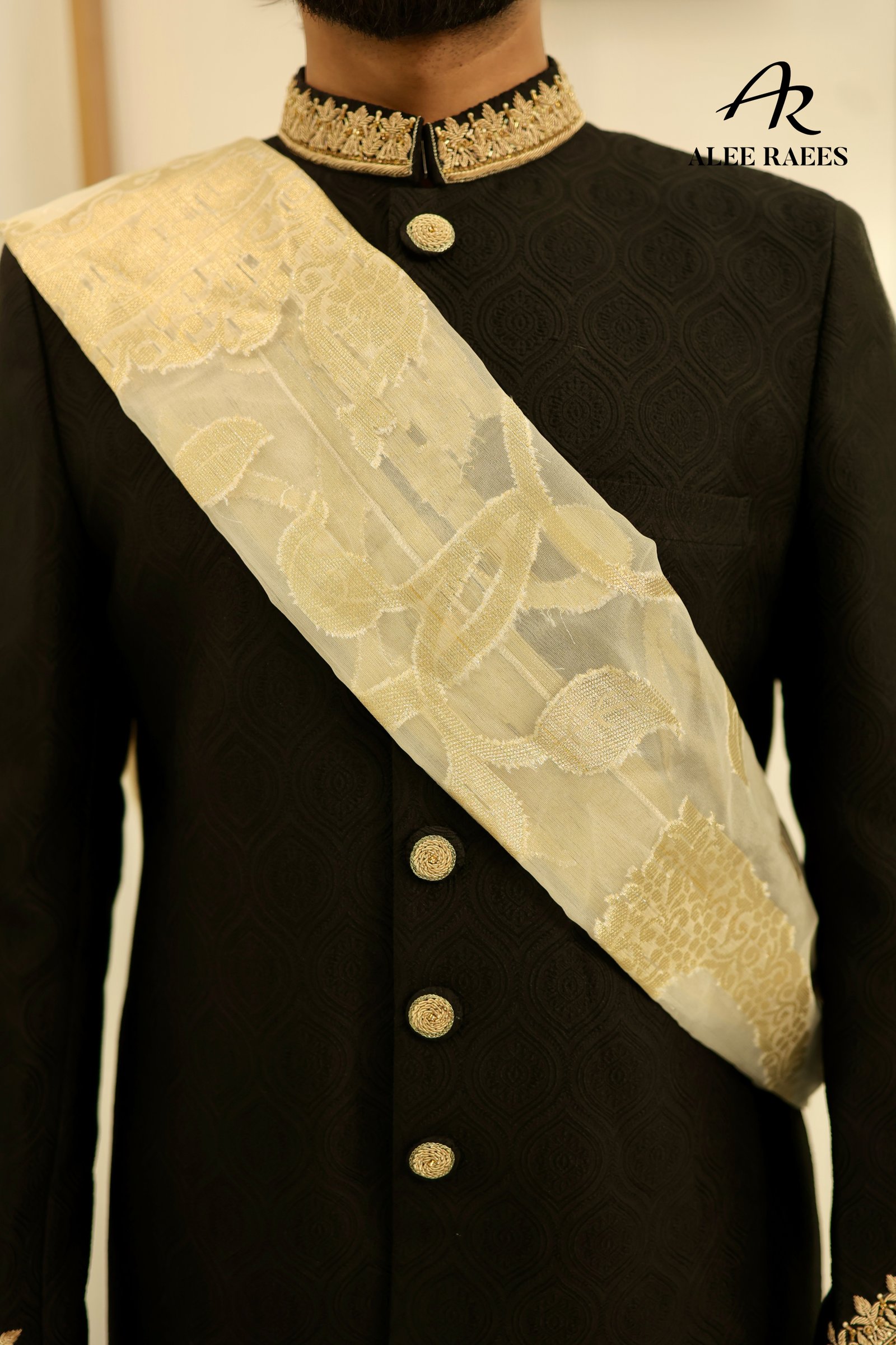 Command attention in the Midnight Majesty Sherwani by ALEE RAEES, rendered in a deep ebony base woven with a subtle geometric jacquard motif. Rich gold-tone accents—from the intricately beaded mandarin collar and cuffs to the hand-rolled buttons—add regal contrast. A sheer ivory-gold organza sash drapes effortlessly for a refined finish. Tailored with side vents for ease, this sherwani pairs with slim-fit black churidar trousers and a coordinating ivory-gold turban. Perfect for evening wedding receptions, sangeet ceremonies, or luxe formal celebrations.