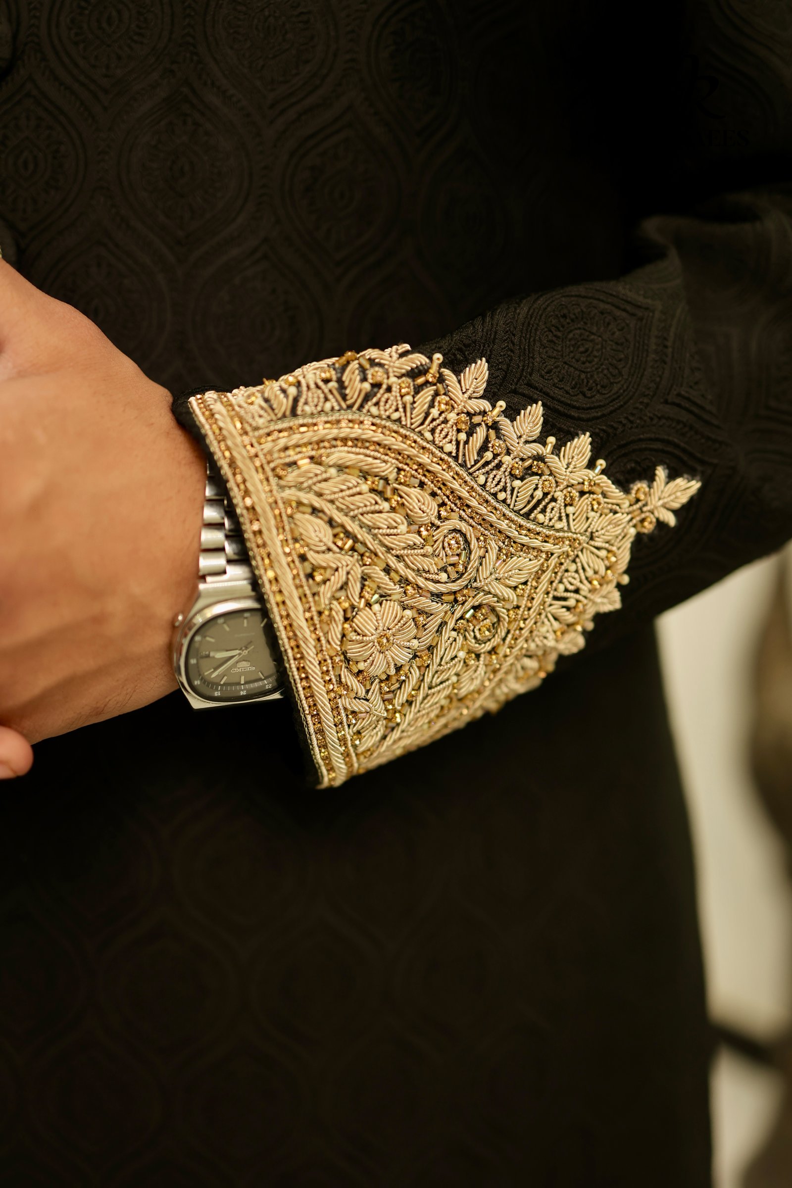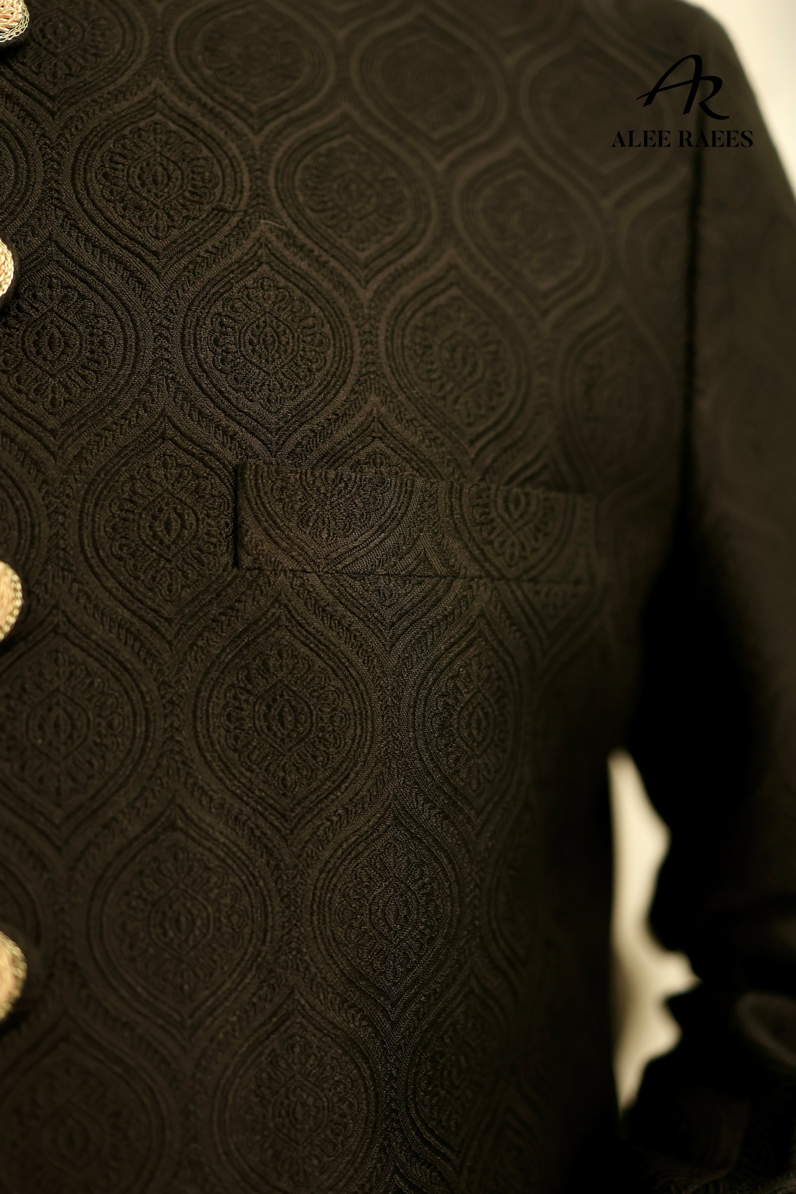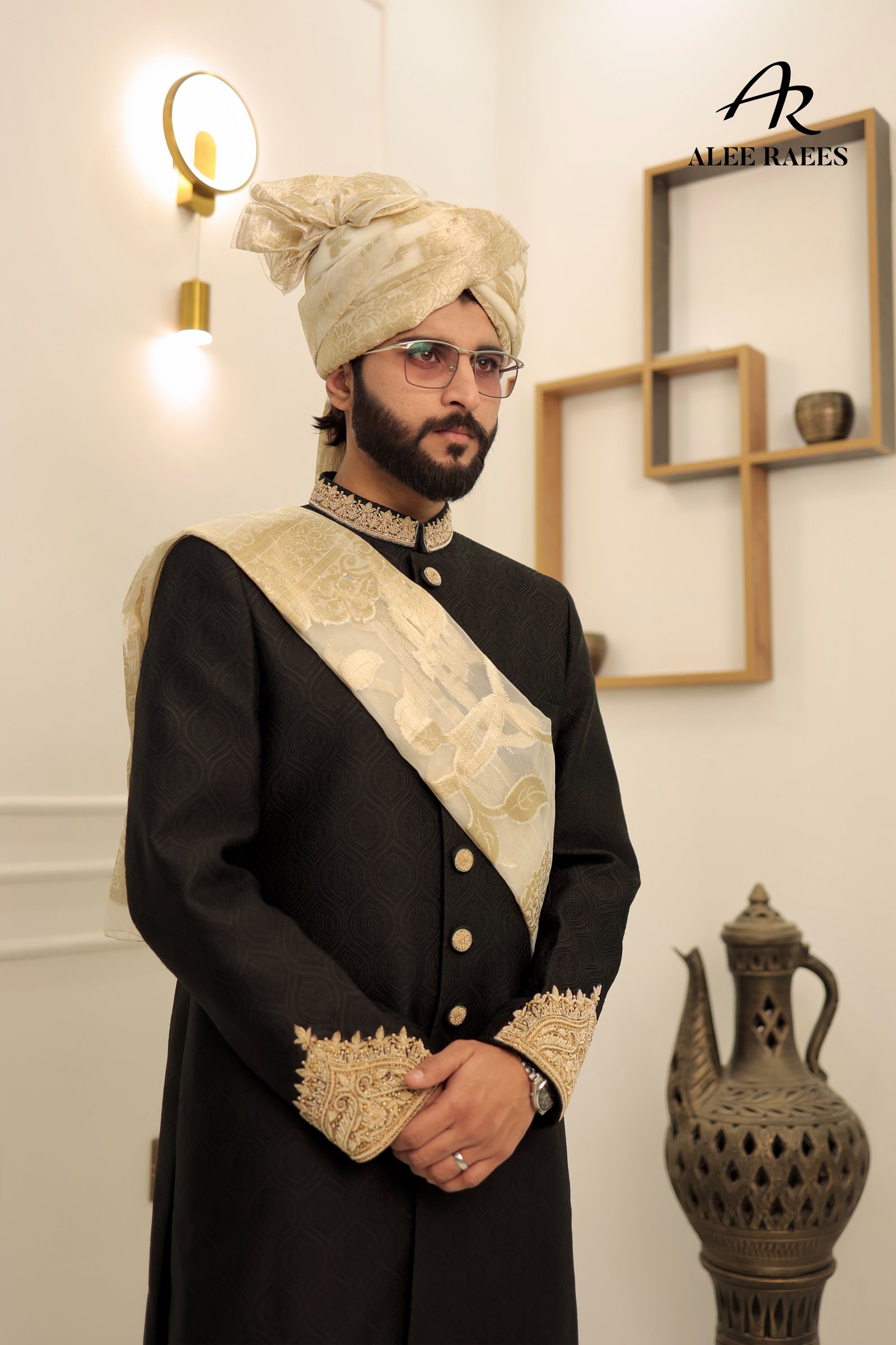 Command attention in the Midnight Majesty Sherwani by ALEE RAEES, rendered in a deep ebony base woven with a subtle geometric jacquard motif. Rich gold-tone accents—from the intricately beaded mandarin collar and cuffs to the hand-rolled buttons—add regal contrast. A sheer ivory-gold organza sash drapes effortlessly for a refined finish. Tailored with side vents for ease, this sherwani pairs with slim-fit black churidar trousers and a coordinating ivory-gold turban. Perfect for evening wedding receptions, sangeet ceremonies, or luxe formal celebrations.