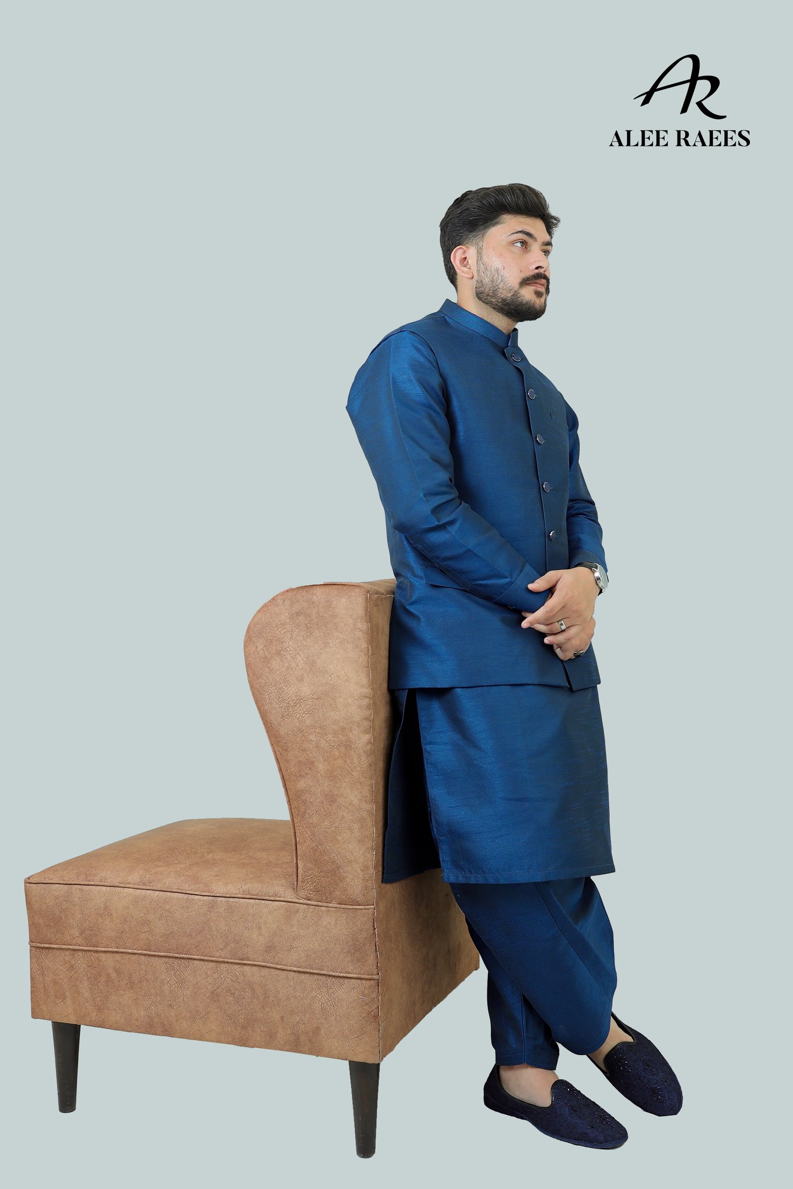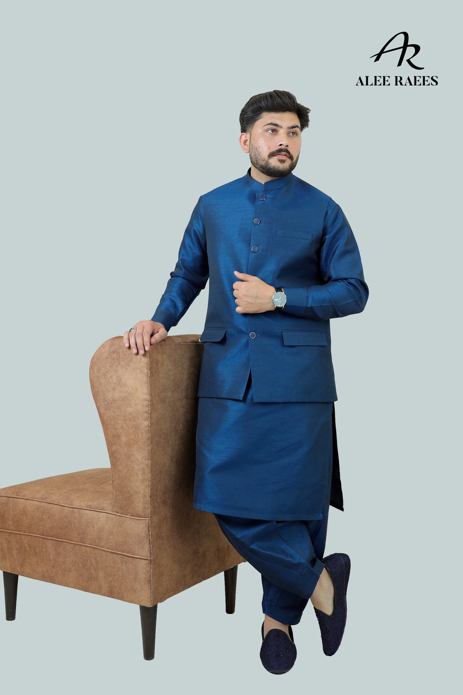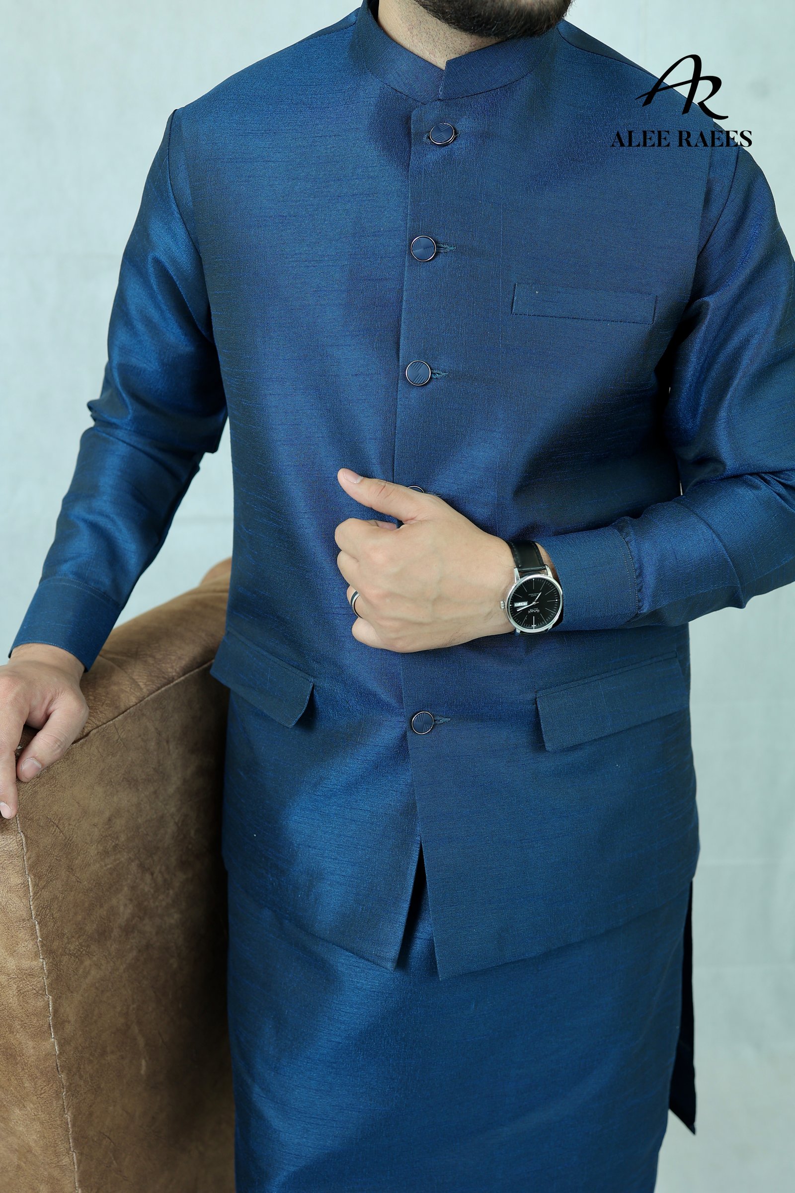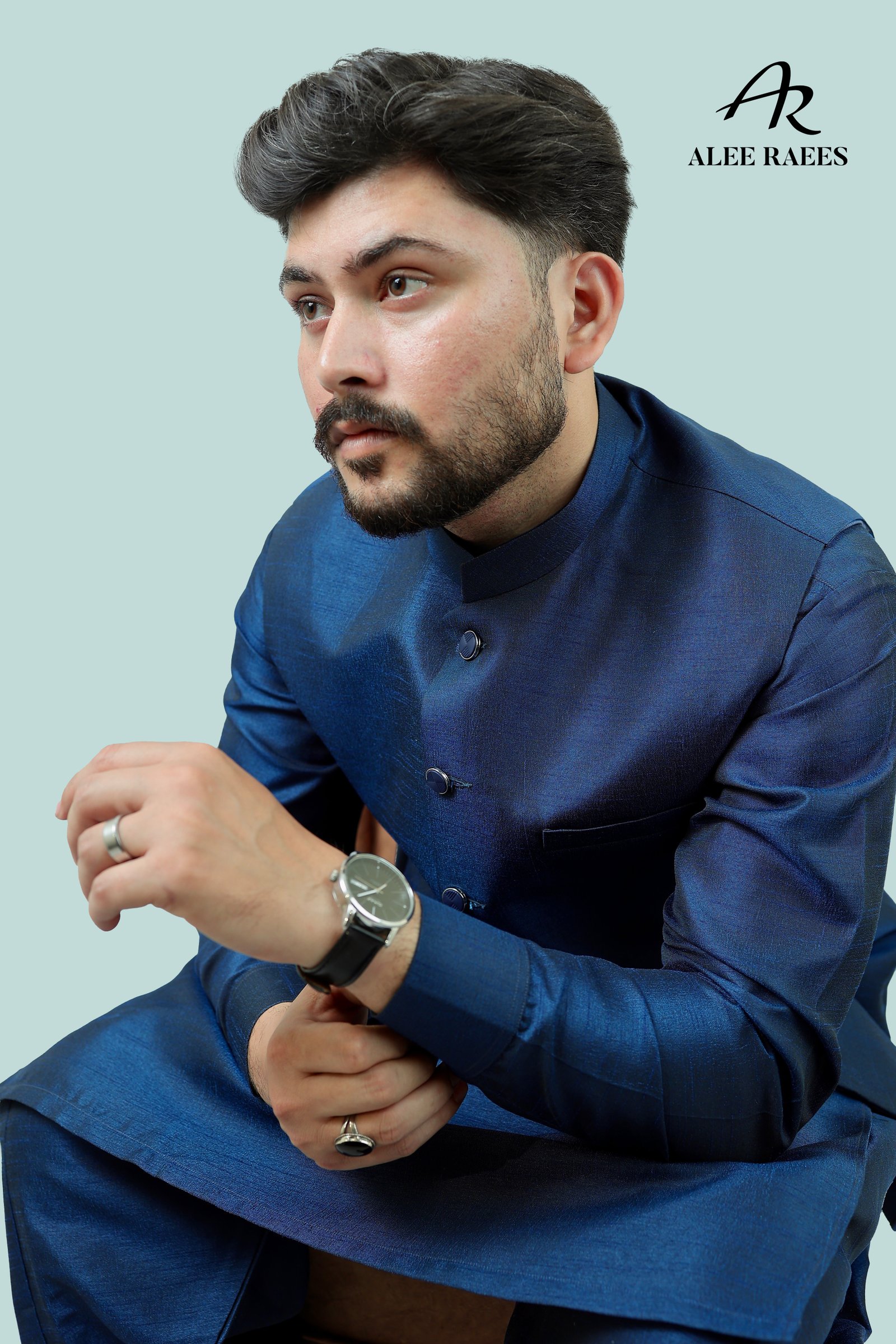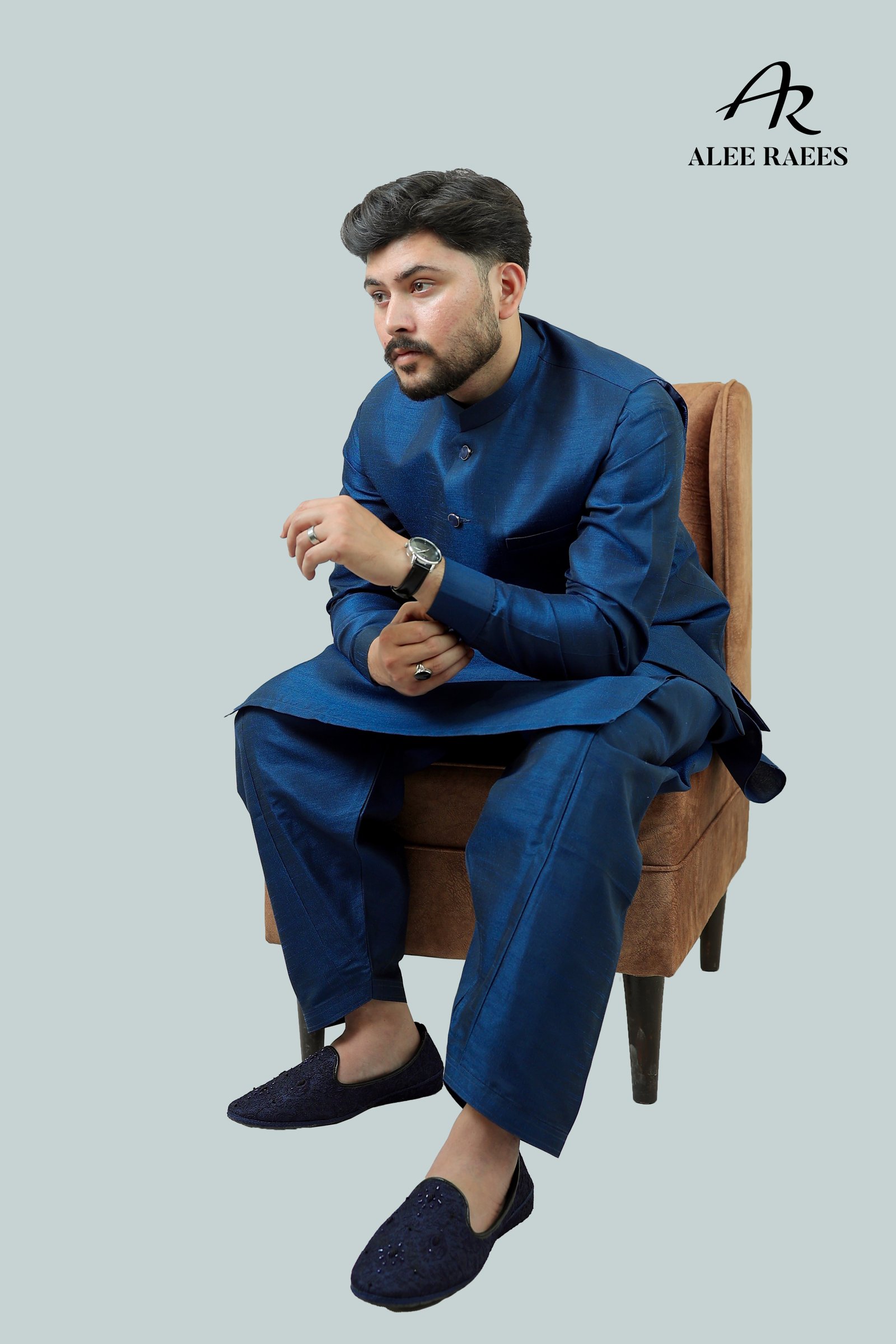 Elevate your festive wardrobe with the Midnight Majesty Ensemble by ALEE RAEES. This coordinated set features a rich cobalt-blue Nehru jacket in a subtle iridescent silk blend, paired with a matching kurta and fitted churidar trousers. The jacket’s sleek mandarin collar and tonal fabric-covered buttons lend a modern edge, while the flap pockets and front vent add practicality and ease. Perfect for daytime celebrations, formal gatherings, or a refined wedding guest look, this ensemble promises a polished silhouette with minimal fuss.