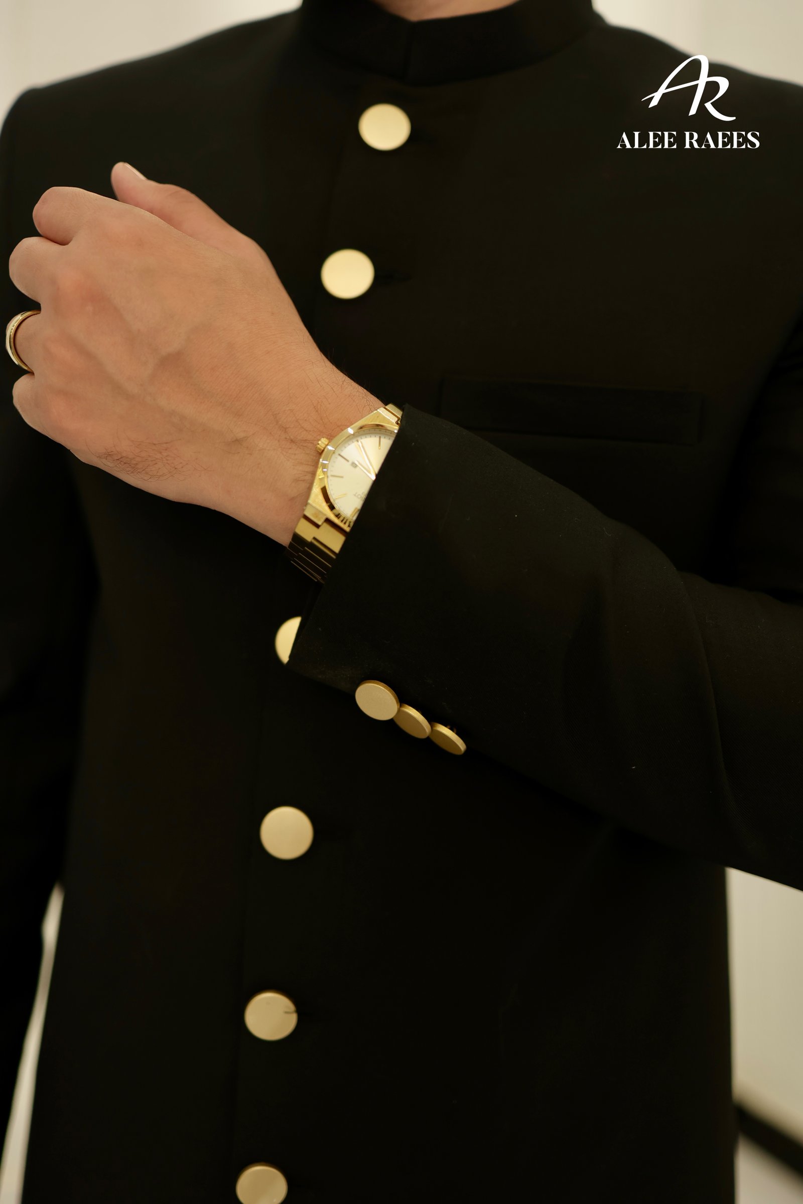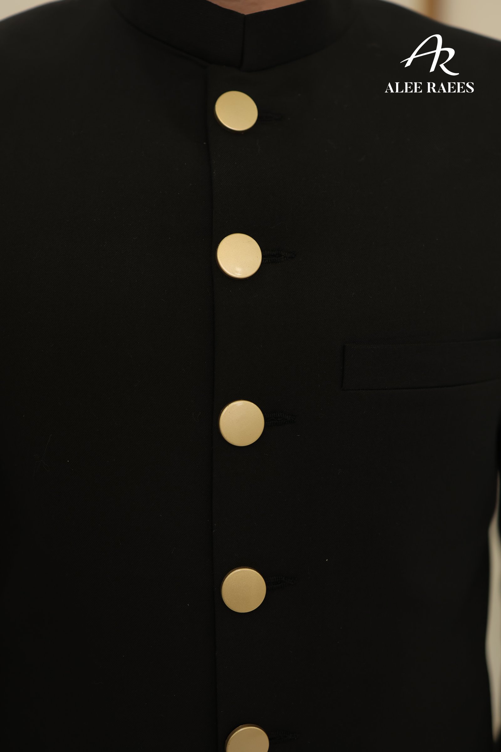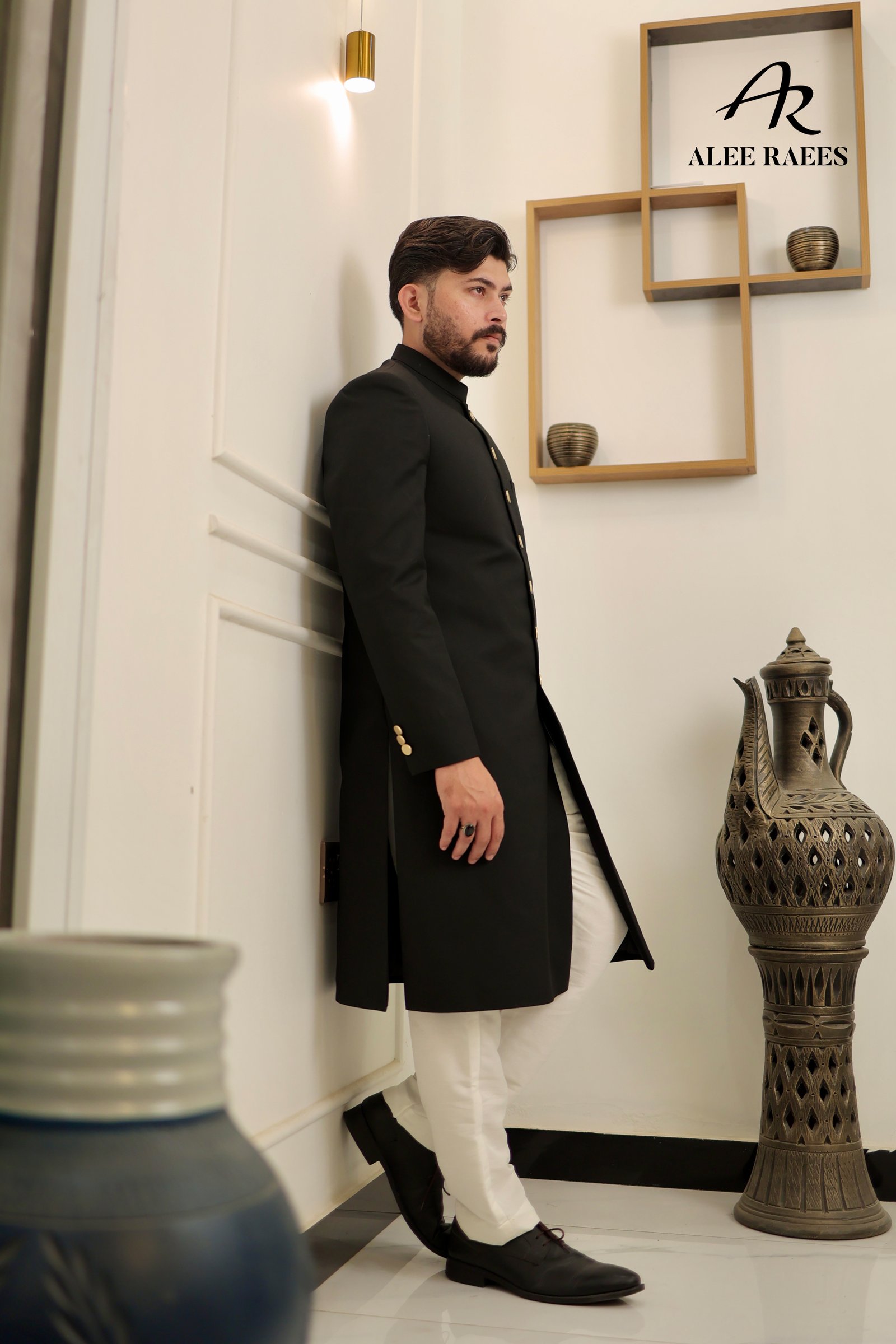 Embrace timeless elegance in the Midnight Regent Sherwani by ALEE RAEES. Tailored from a luxurious black jacquard fabric with a subtle tonal pattern, this full-length sherwani features a sleek mandarin collar and a row of oversized matte-gold buttons for a modern yet regal finish. The clean chest welt pocket and side pockets maintain a minimalist silhouette, while the slim, structured cut flatters any frame. Finished with discrete side vents for ease of movement, the Midnight Regent is ideal for evening weddings, receptions, or formal gala affairs where you want to project confidence in classic black.