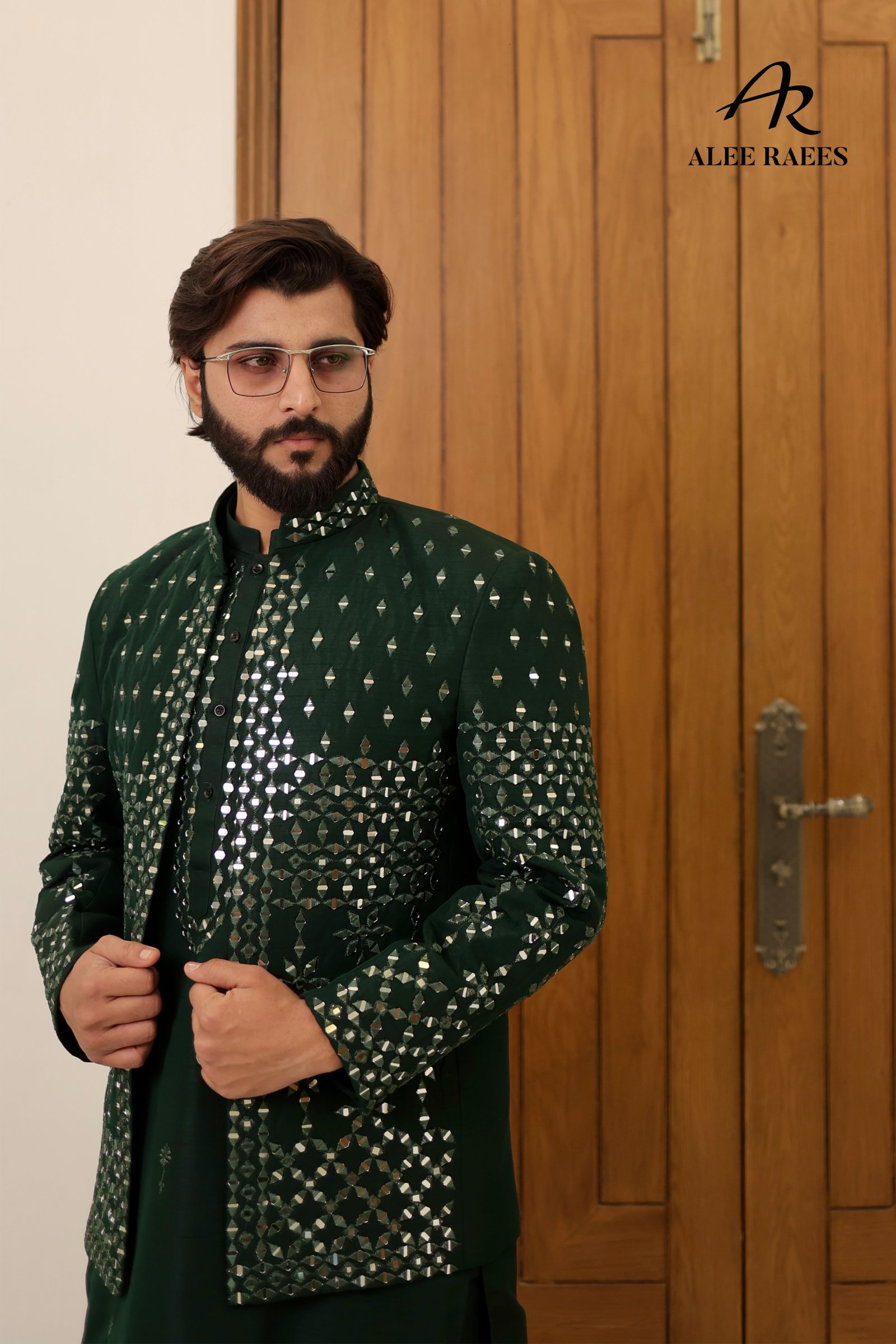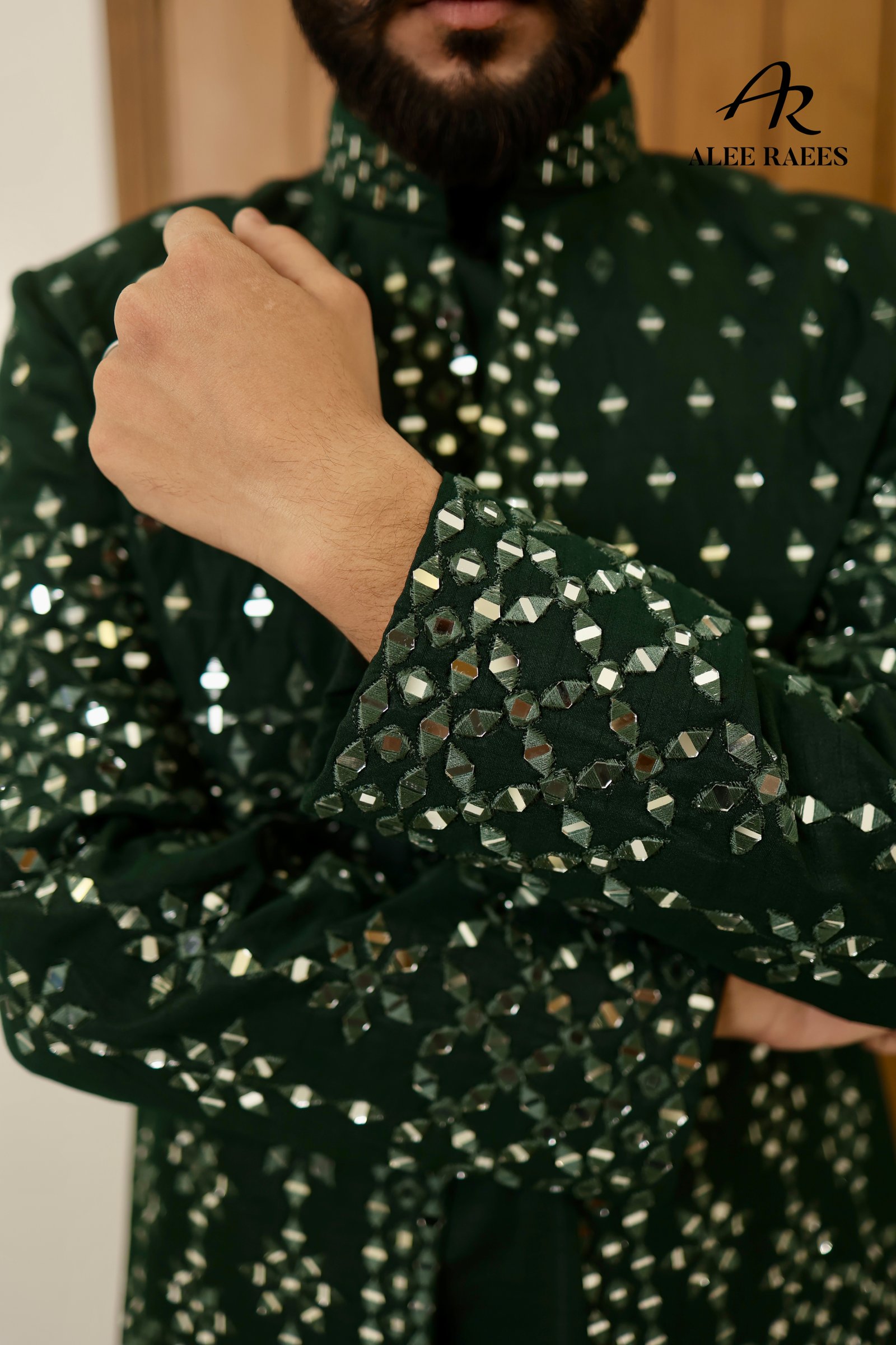 Step into the spotlight with the Reflective Royale prince coat ensemble—a masterful fusion of traditional tailoring and contemporary shimmer. The deep emerald kurta is cut from a luxuriously soft silk-blend, fully adorned with hand-stitched mirror motifs that catch the light from every angle. Layered over it is a matching slim-fit prince coat, equally encrusted with geometric mirror work across the front and cuffs. Subtle scalloped trims along the edges give a refined finish, while the mandarin collar maintains a timeless silhouette. Paired with coordinating churidar trousers, this set transitions effortlessly from festive celebrations to evening receptions, ensuring you shine in style.