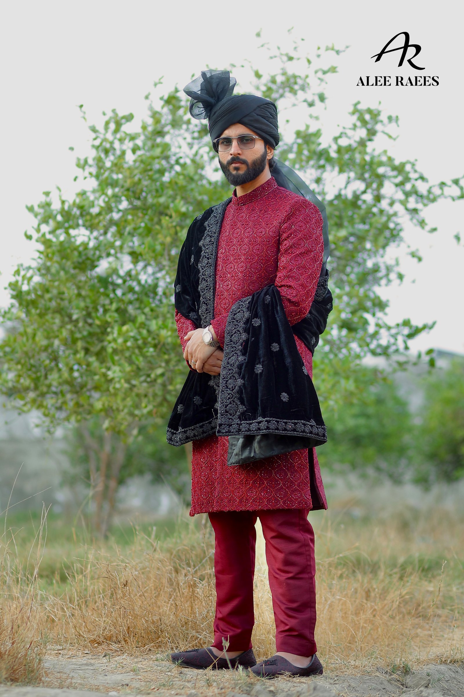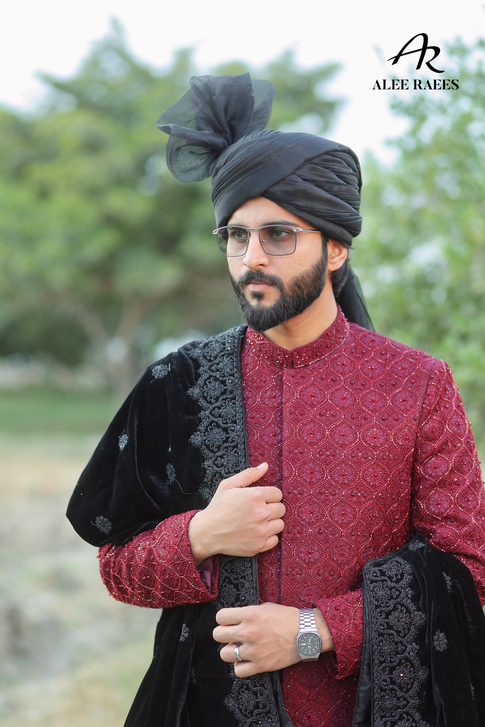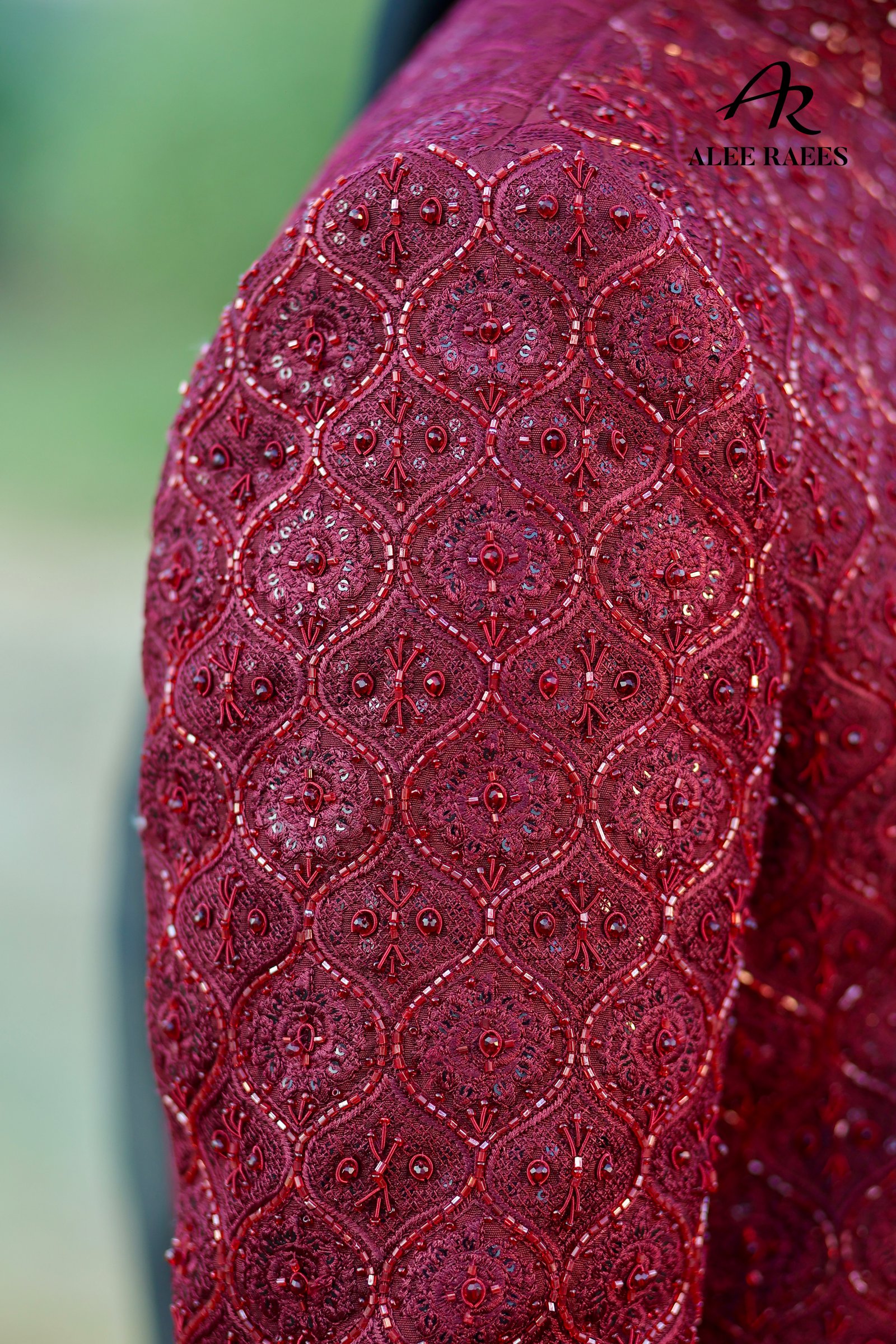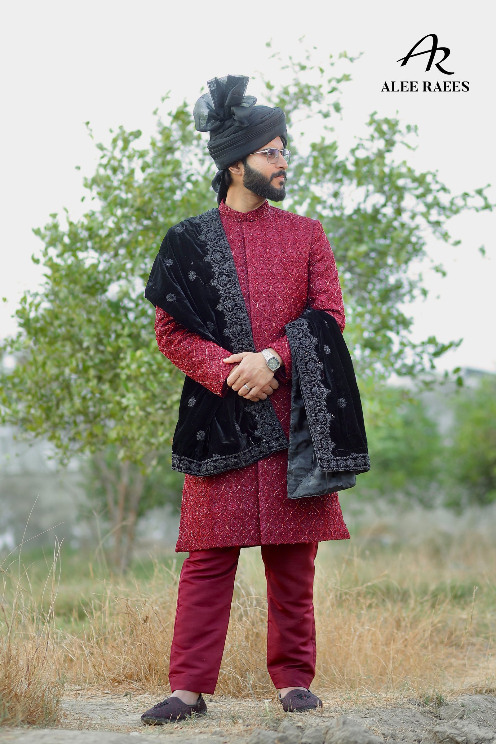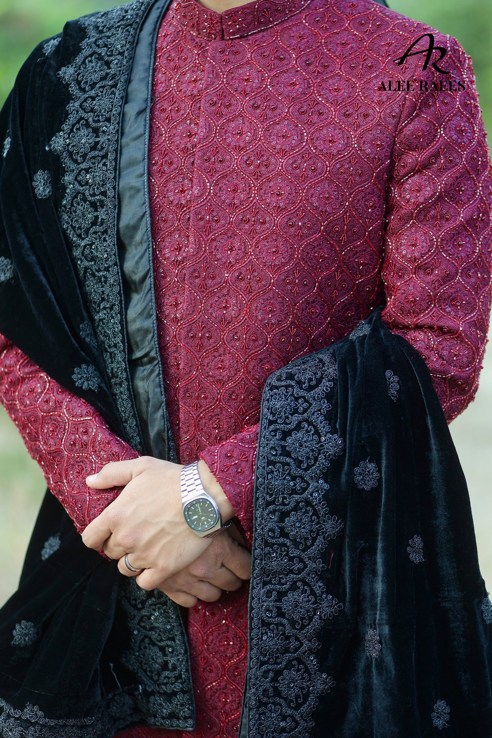 Command attention in the Maroon Majesty Sherwani from ALEE RAEES, a statement-making ensemble crafted for the modern groom. This richly hued maroon sherwani features an all-over geometric embroidery pattern, hand-set beads, sequins, and tonal threadwork creating a captivating mosaic of detail. A high-band collar and concealed placket maintain a sleek silhouette, while the tailored cut ensures a flattering fit from chest to hem. Draped over the shoulder, the accompanying black velvet shawl offers luxurious contrast: its dense embroidery of floral motifs and shimmering accents complements the sherwani’s embellishments. Whether it’s your wedding day or a grand reception, this sherwani set radiates regal confidence and artisanal finesse.