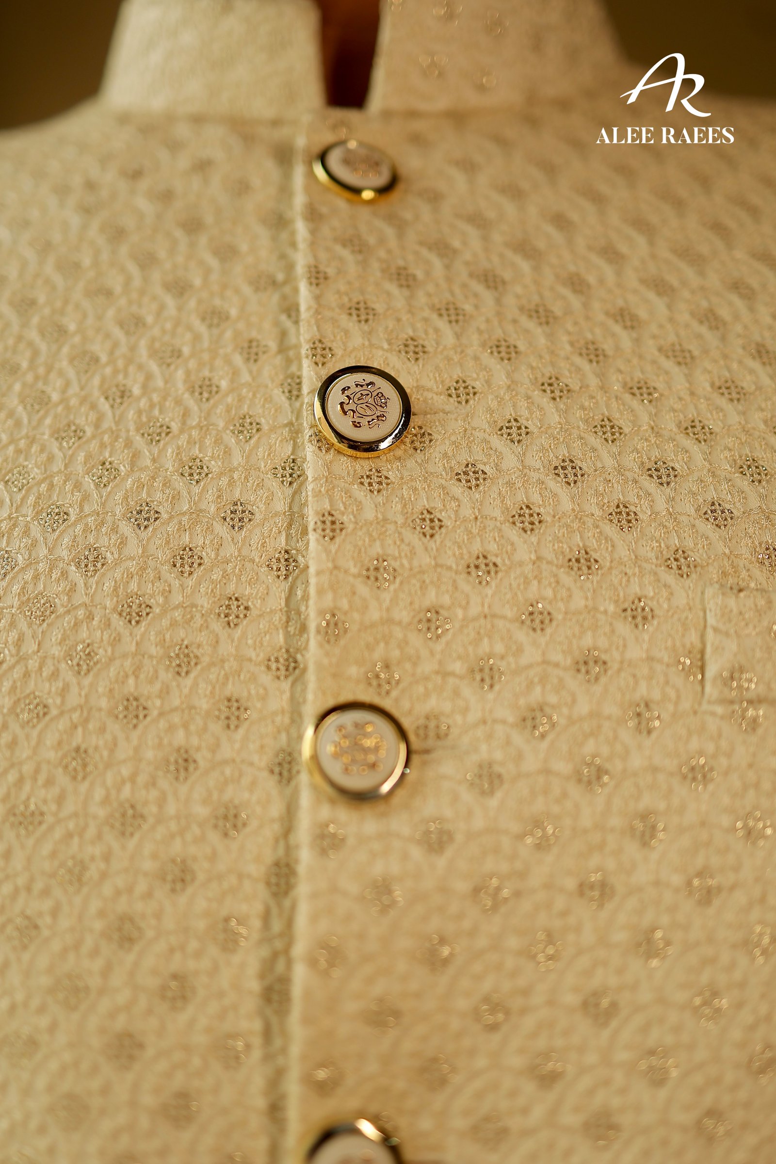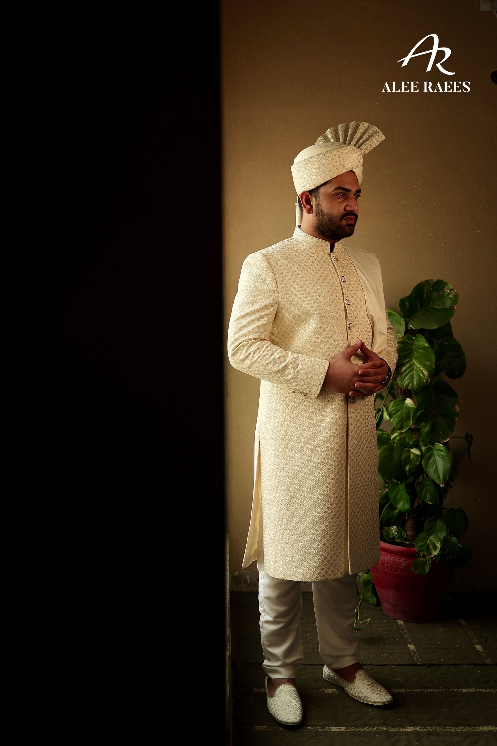 Elevate your wedding day look with the Regal Ivory Sherwani Ensemble by ALEE RAEES. This intricately embroidered sherwani is cut from a luxe ivory jacquard weave, featuring a classic mandarin collar, concealed button placket with custom metal buttons, and subtly angled side vents for ease of movement. The all-over micro-motif embroidery adds depth and richness, while the long, fitted silhouette flatters the frame. It’s paired with a coordinating ivory churidar-style shalwar, and finished with a flowing ivory satin dupatta draped over one shoulder for an air of refined elegance. A matching ivory turban with a sculpted plume completes the traditional groom’s attire, making Regal Ivory the perfect choice for a sophisticated, memorable ceremony.