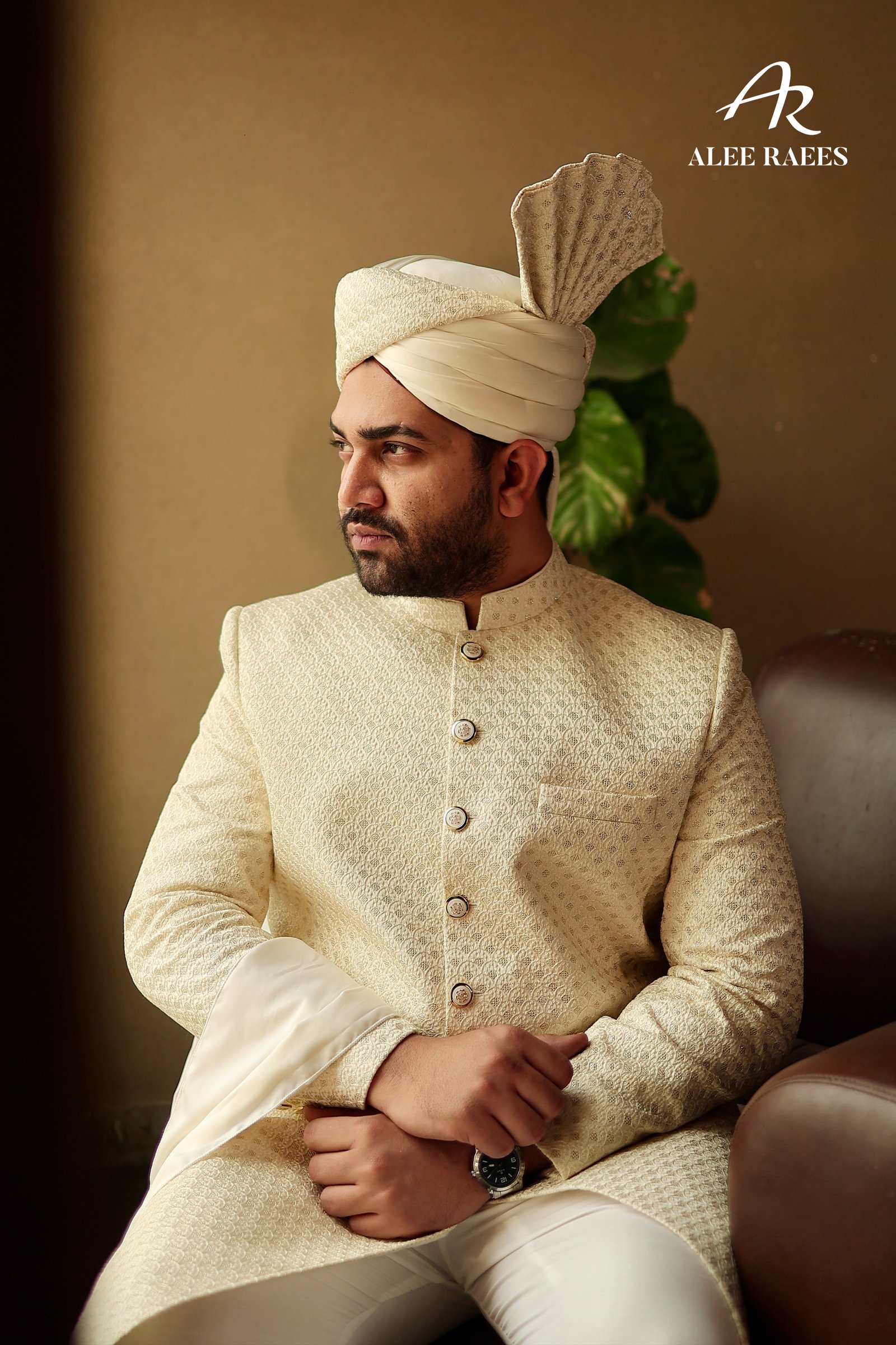 Fabrics: Jacquard woven sherwani, satin dupatta, matching turban fabric, stretch-back churidar shalwar