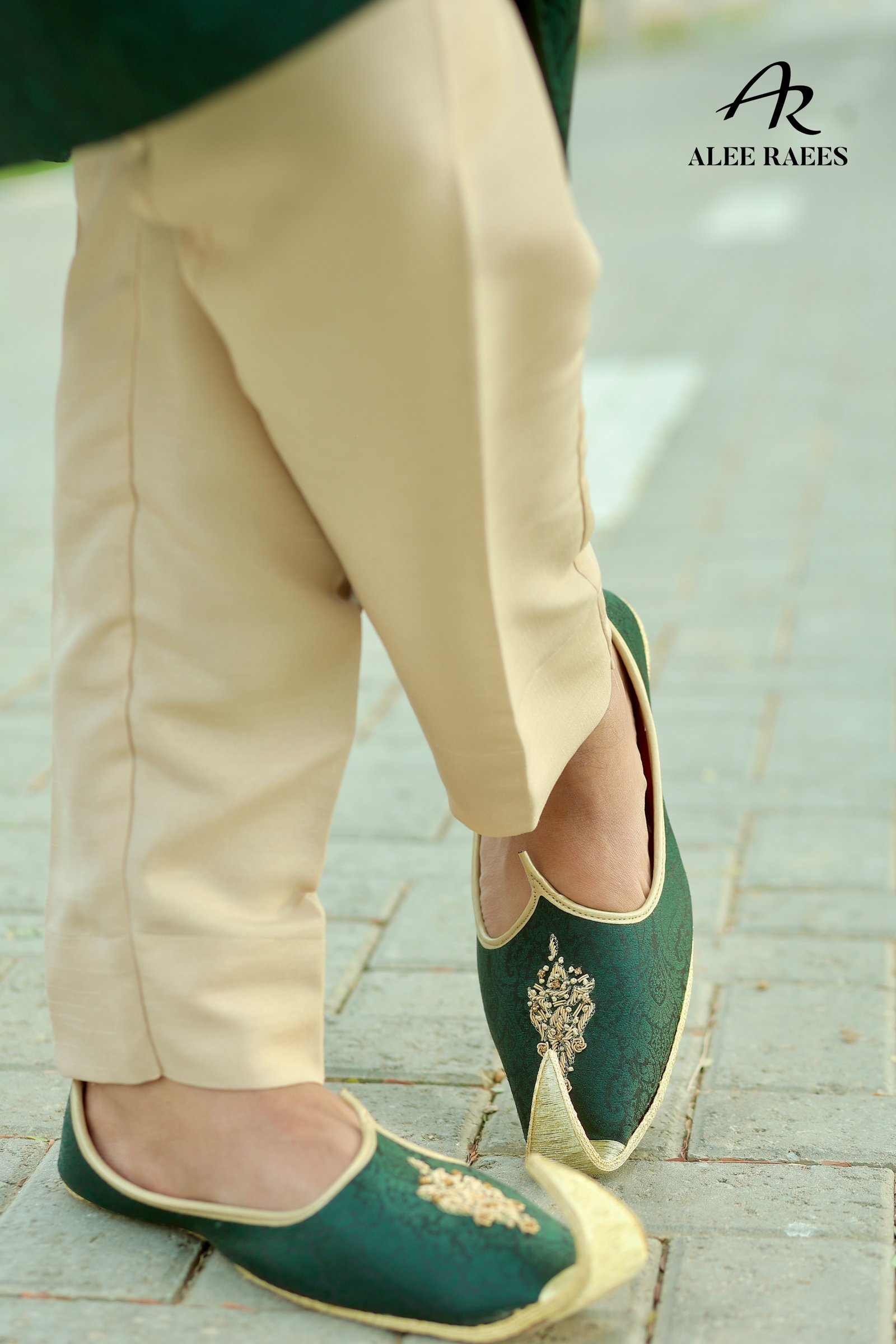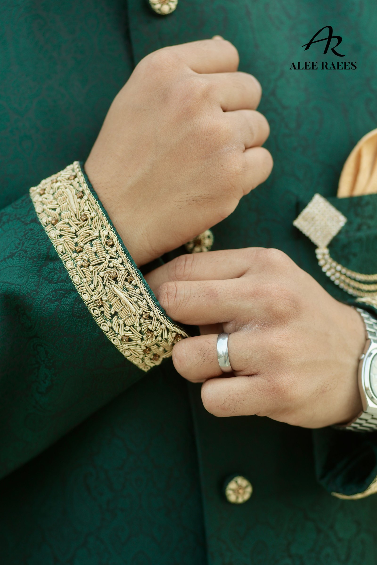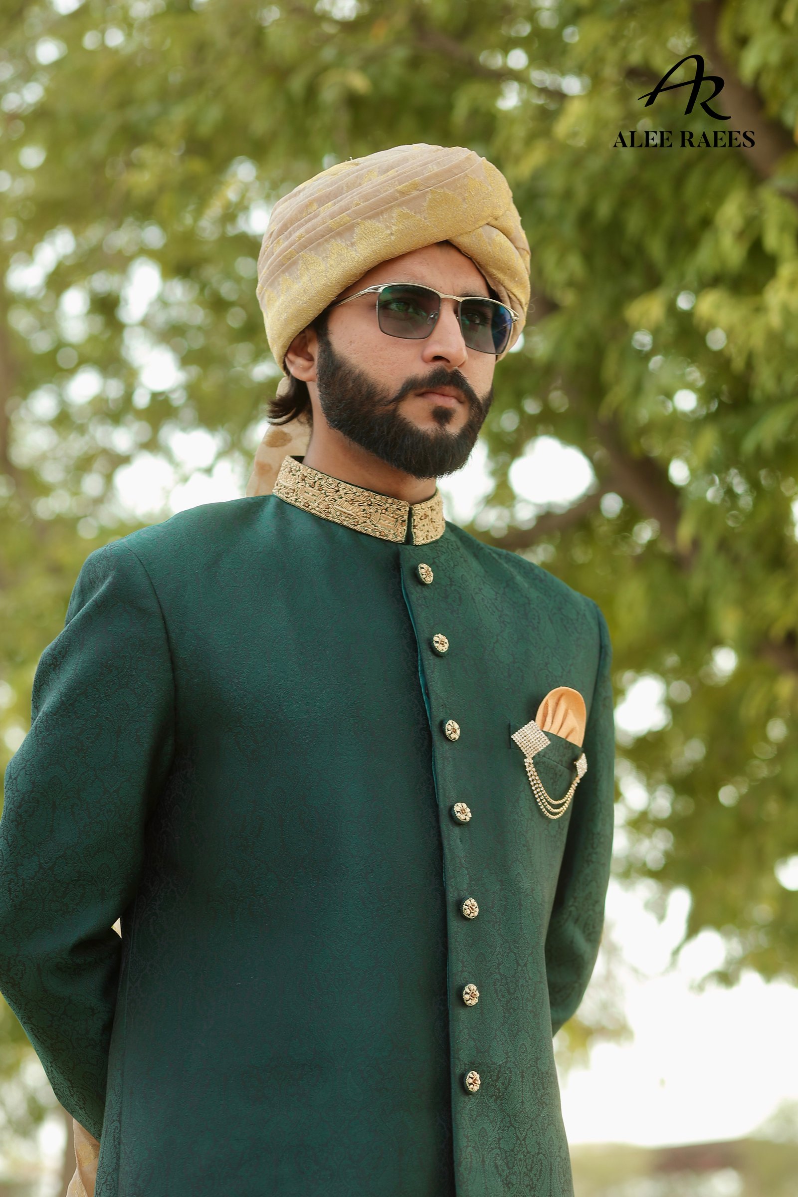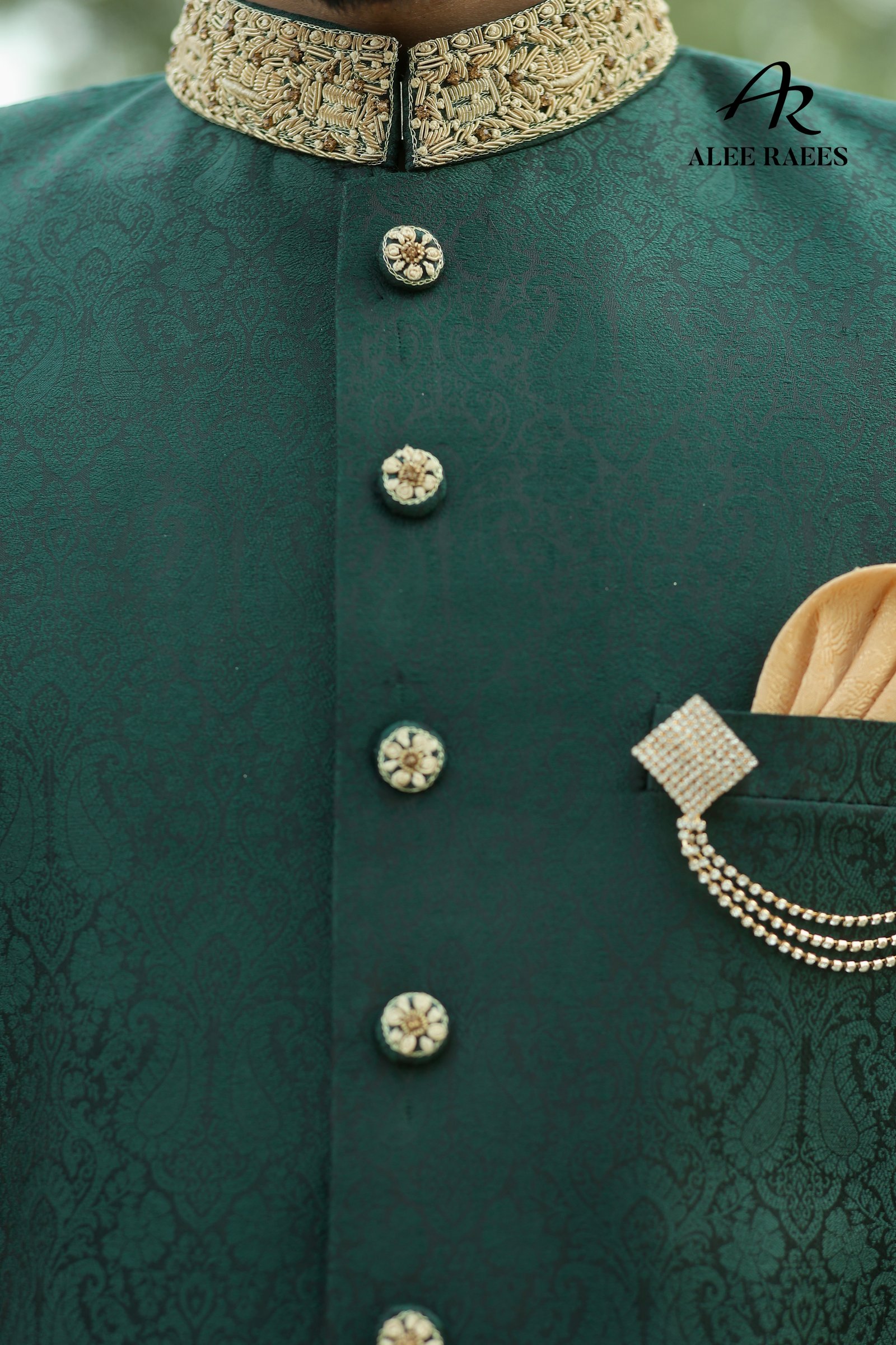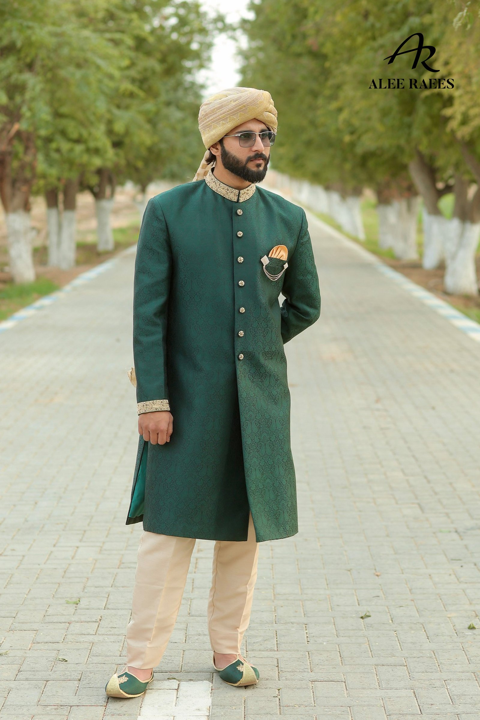 Step into a world of heritage luxury with the Emerald Reverie sherwani ensemble from ALEE RAEES. Rich forest-green jacquard fabric, woven with delicate paisley motifs, drapes the mandarin-collar sherwani, while hand-embroidered gold zardozi trim at the collar and cuffs adds artisanal sparkle. A sleek beige churidar balances the deep hues, and the ensemble is elevated with a pale-gold brocade turban and matching pocket square accented by cascading pearl chains. Intricately embroidered mojari slippers, with hand-appliquéd gold threadwork, complete this statement look. Designed for grand weddings, festive receptions, or cultural galas, Emerald Reverie makes every moment unforgettable.