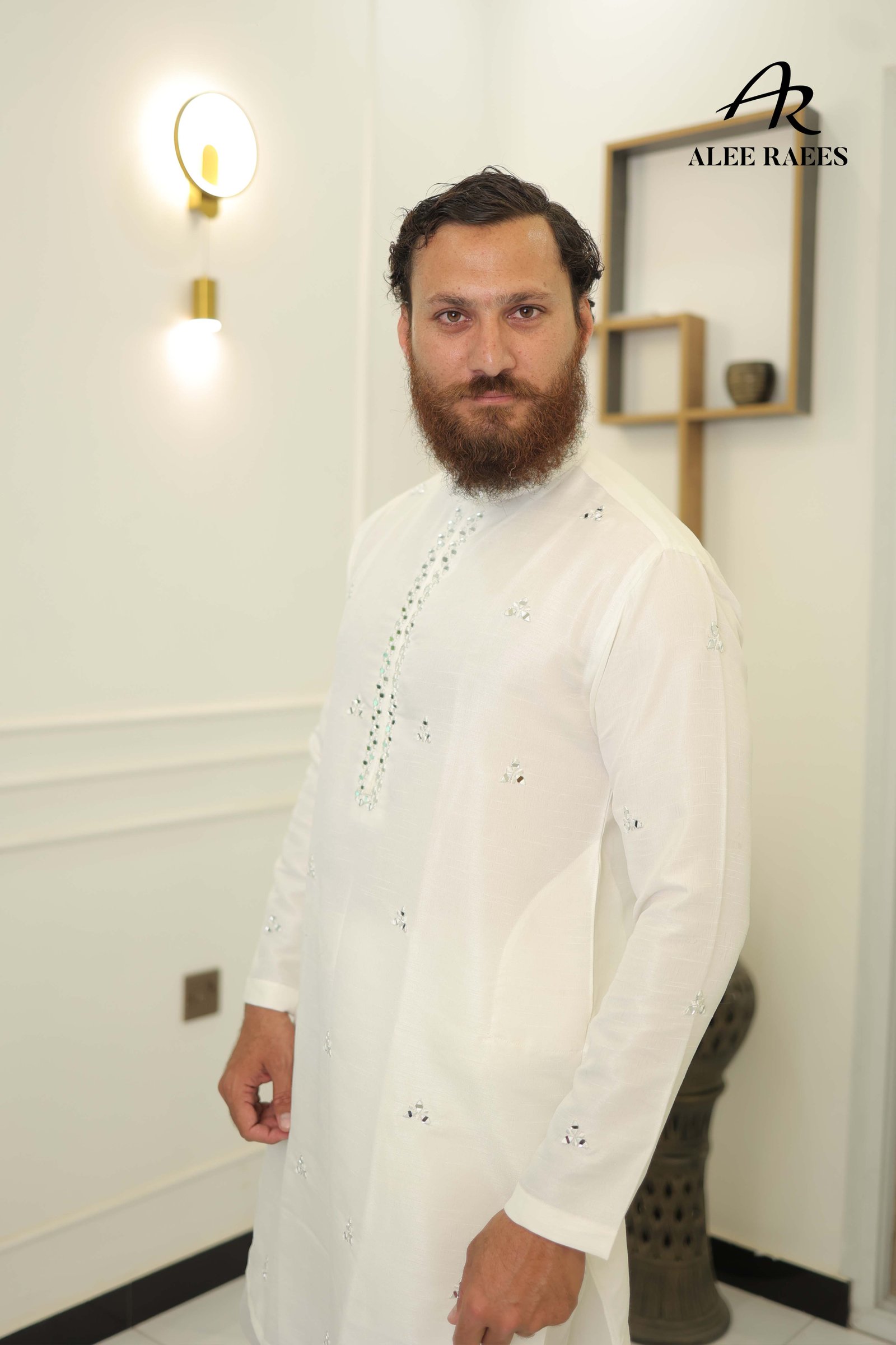 Command attention in this sleek and powerful white shalwar kameez, featuring meticulously hand-embroidered mirror work on the neckline and collar. Crafted from premium-quality fabric with a subtle sheen, this outfit is the epitome of modern-day festive elegance.