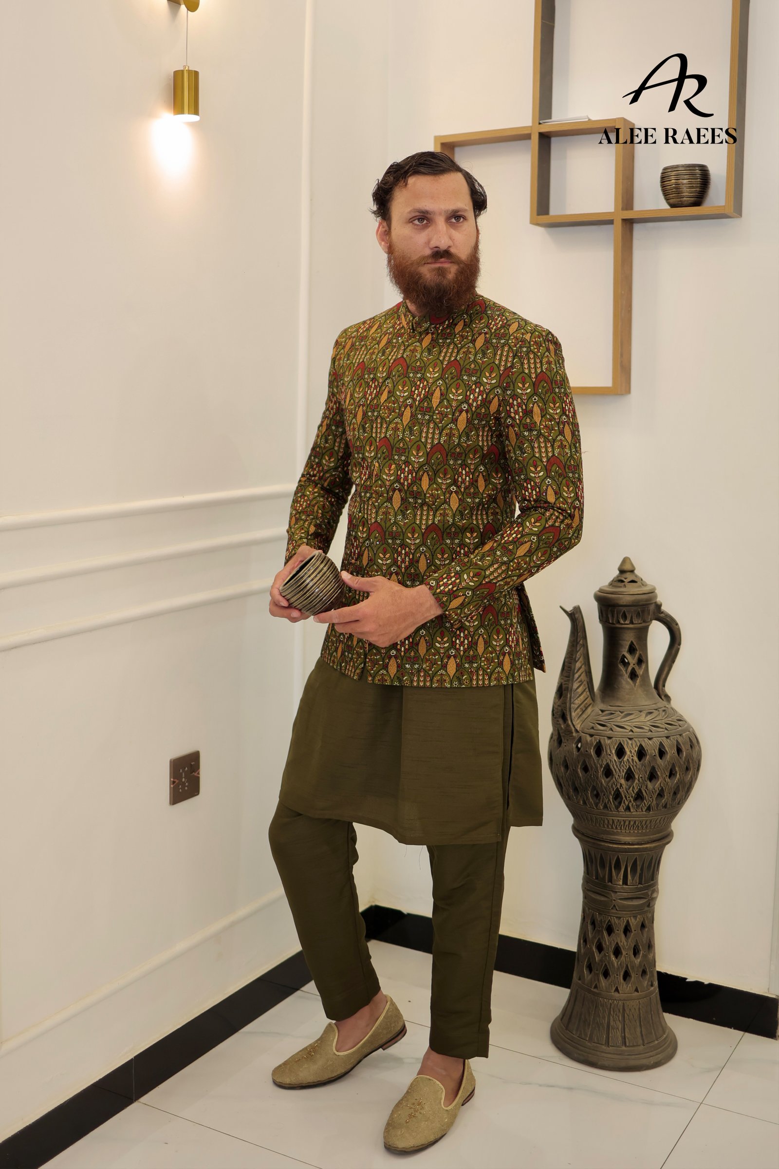 Make a striking entrance in the Verdant Tapestry ensemble by ALEE RAEES. This artisanal prince coat, woven in a rich olive-green jacquard with intricate botanical motifs, sits perfectly over a matching plain kurta and shalwar in a complementary deep olive hue. The tailored, slim-fit coat features a band collar, covered button placket, and side vents for ease of movement. Crafted from a premium silk-blend for subtle sheen and structure, this set is ideal for daytime wedding events, festive gatherings, or cultural soirées where you want to stand out with refined taste.