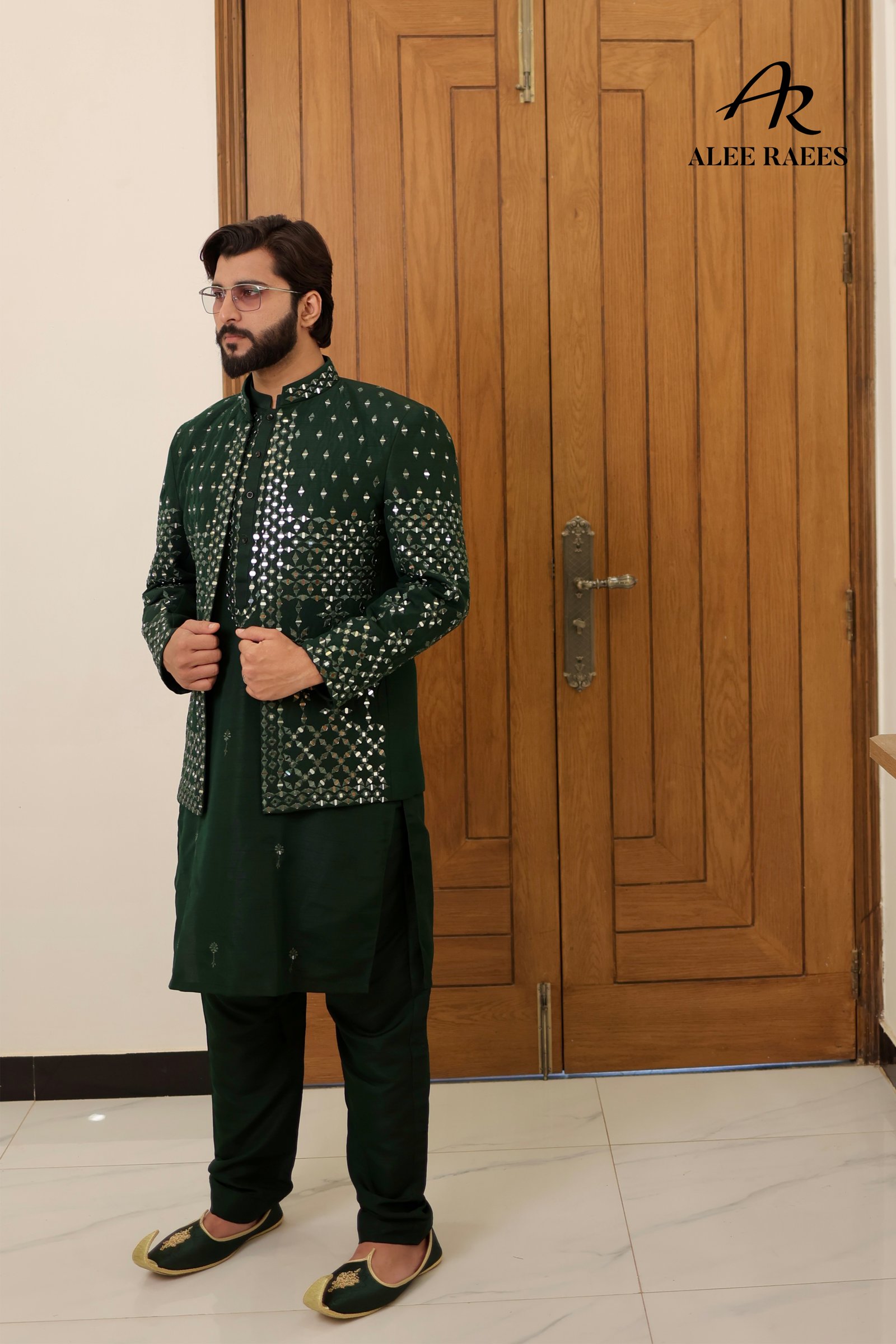 Step into the spotlight with the Reflective Royale prince coat ensemble—a masterful fusion of traditional tailoring and contemporary shimmer. The deep emerald kurta is cut from a luxuriously soft silk-blend, fully adorned with hand-stitched mirror motifs that catch the light from every angle. Layered over it is a matching slim-fit prince coat, equally encrusted with geometric mirror work across the front and cuffs. Subtle scalloped trims along the edges give a refined finish, while the mandarin collar maintains a timeless silhouette. Paired with coordinating churidar trousers, this set transitions effortlessly from festive celebrations to evening receptions, ensuring you shine in style.