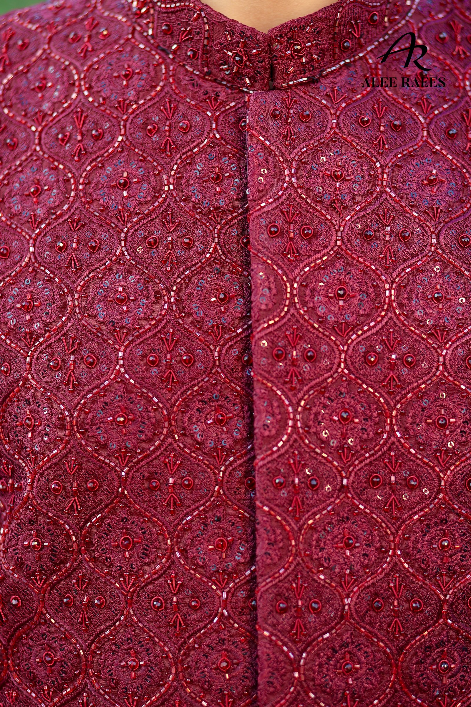 Command attention in the Maroon Majesty Sherwani from ALEE RAEES, a statement-making ensemble crafted for the modern groom. This richly hued maroon sherwani features an all-over geometric embroidery pattern, hand-set beads, sequins, and tonal threadwork creating a captivating mosaic of detail. A high-band collar and concealed placket maintain a sleek silhouette, while the tailored cut ensures a flattering fit from chest to hem. Draped over the shoulder, the accompanying black velvet shawl offers luxurious contrast: its dense embroidery of floral motifs and shimmering accents complements the sherwani’s embellishments. Whether it’s your wedding day or a grand reception, this sherwani set radiates regal confidence and artisanal finesse.