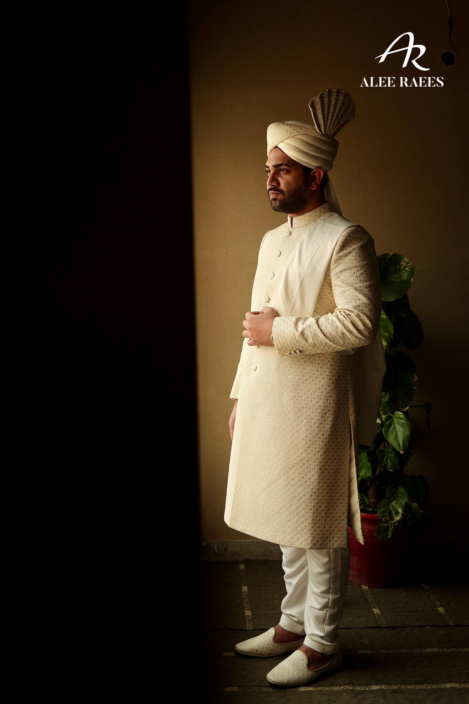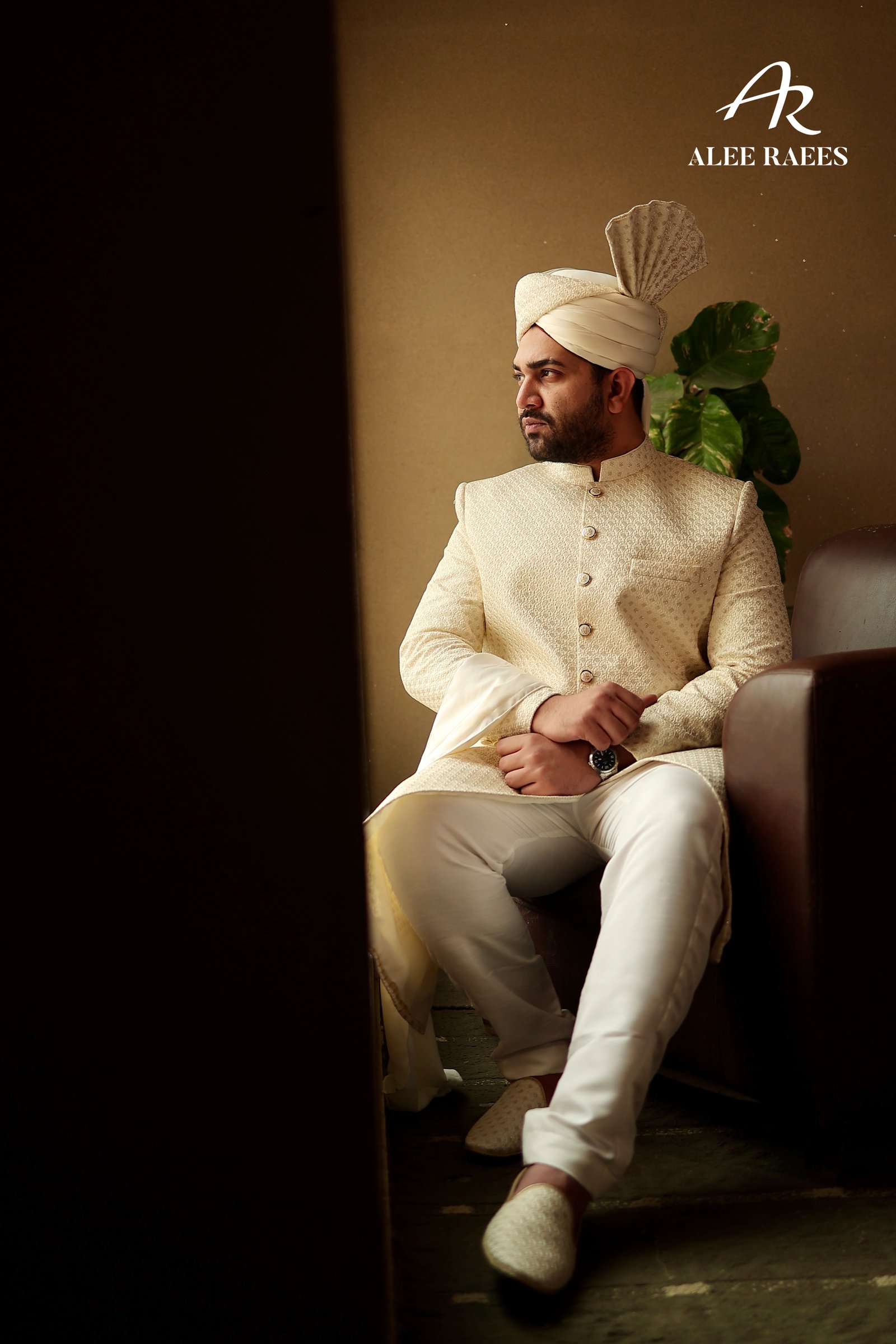 Includes: Sherwani, churidar shalwar, satin dupatta & coordinated turban