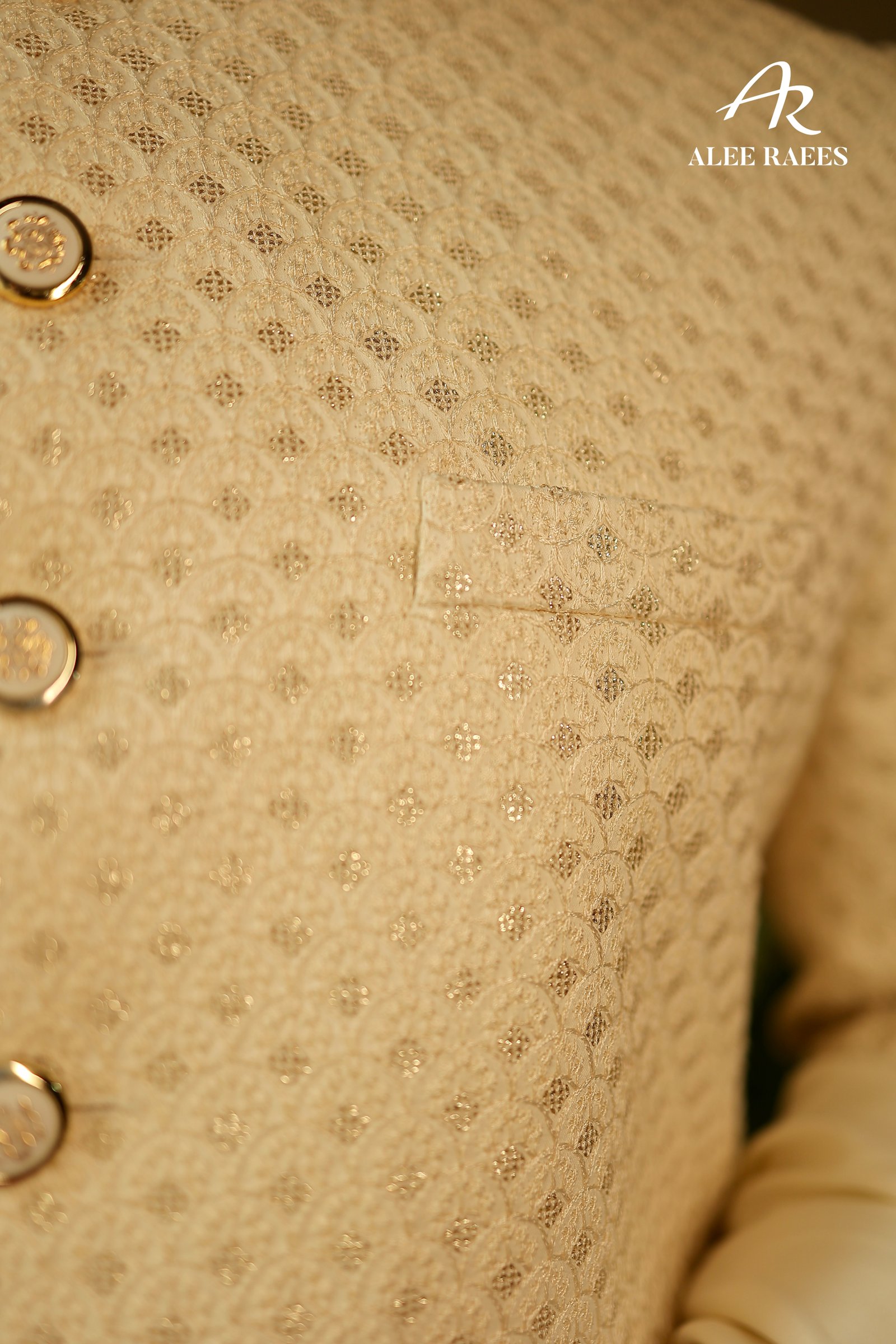 Elevate your wedding day look with the Regal Ivory Sherwani Ensemble by ALEE RAEES. This intricately embroidered sherwani is cut from a luxe ivory jacquard weave, featuring a classic mandarin collar, concealed button placket with custom metal buttons, and subtly angled side vents for ease of movement. The all-over micro-motif embroidery adds depth and richness, while the long, fitted silhouette flatters the frame. It’s paired with a coordinating ivory churidar-style shalwar, and finished with a flowing ivory satin dupatta draped over one shoulder for an air of refined elegance. A matching ivory turban with a sculpted plume completes the traditional groom’s attire, making Regal Ivory the perfect choice for a sophisticated, memorable ceremony.