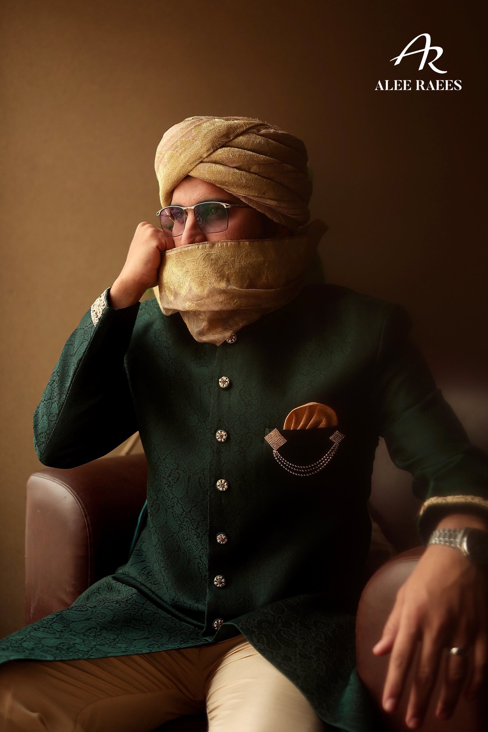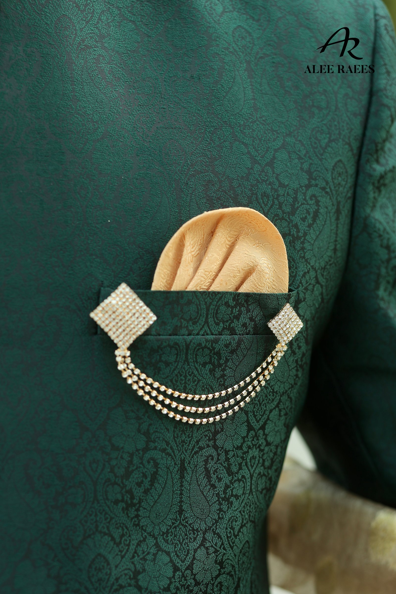 Step into a world of heritage luxury with the Emerald Reverie sherwani ensemble from ALEE RAEES. Rich forest-green jacquard fabric, woven with delicate paisley motifs, drapes the mandarin-collar sherwani, while hand-embroidered gold zardozi trim at the collar and cuffs adds artisanal sparkle. A sleek beige churidar balances the deep hues, and the ensemble is elevated with a pale-gold brocade turban and matching pocket square accented by cascading pearl chains. Intricately embroidered mojari slippers, with hand-appliquéd gold threadwork, complete this statement look. Designed for grand weddings, festive receptions, or cultural galas, Emerald Reverie makes every moment unforgettable.