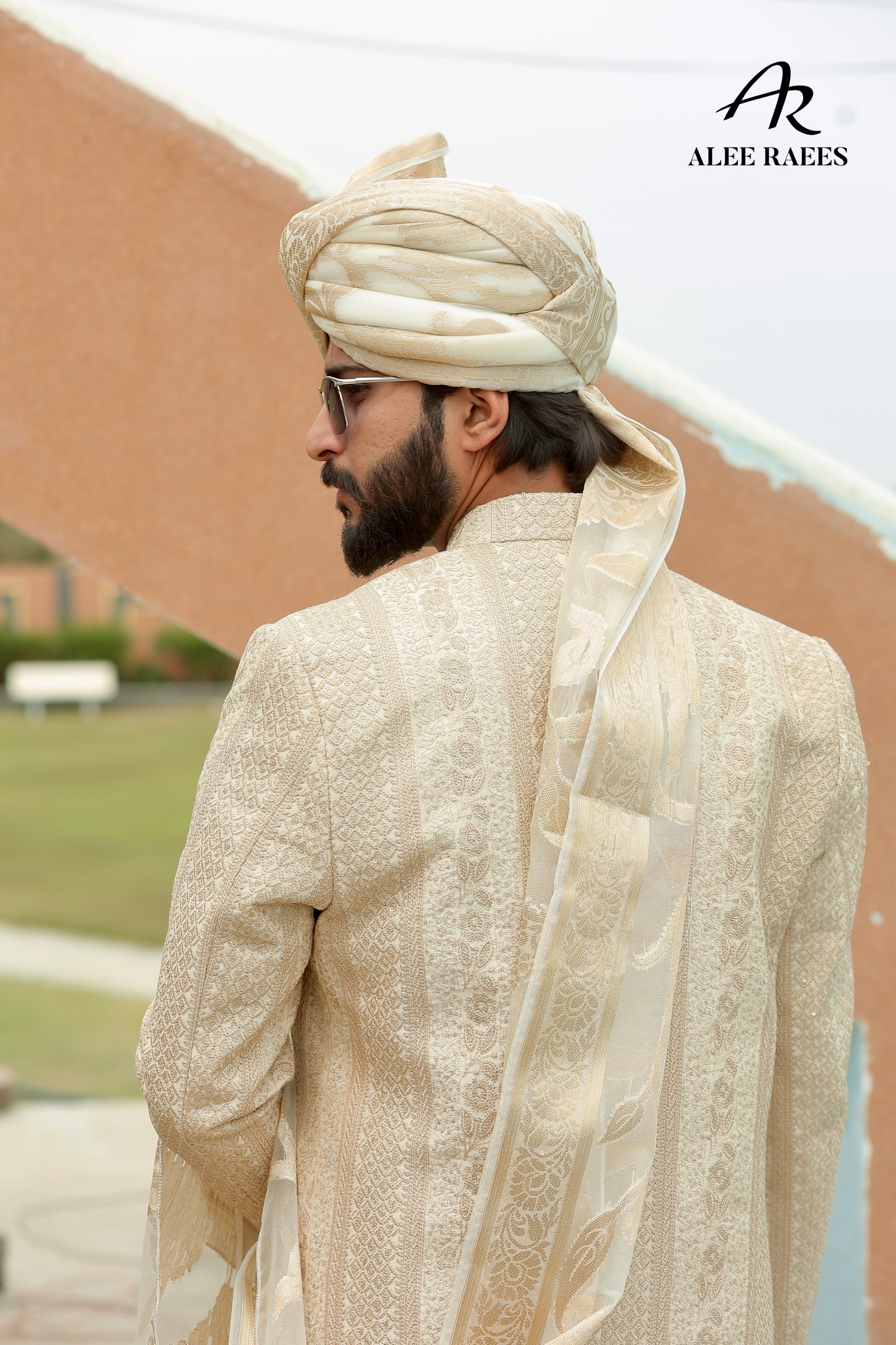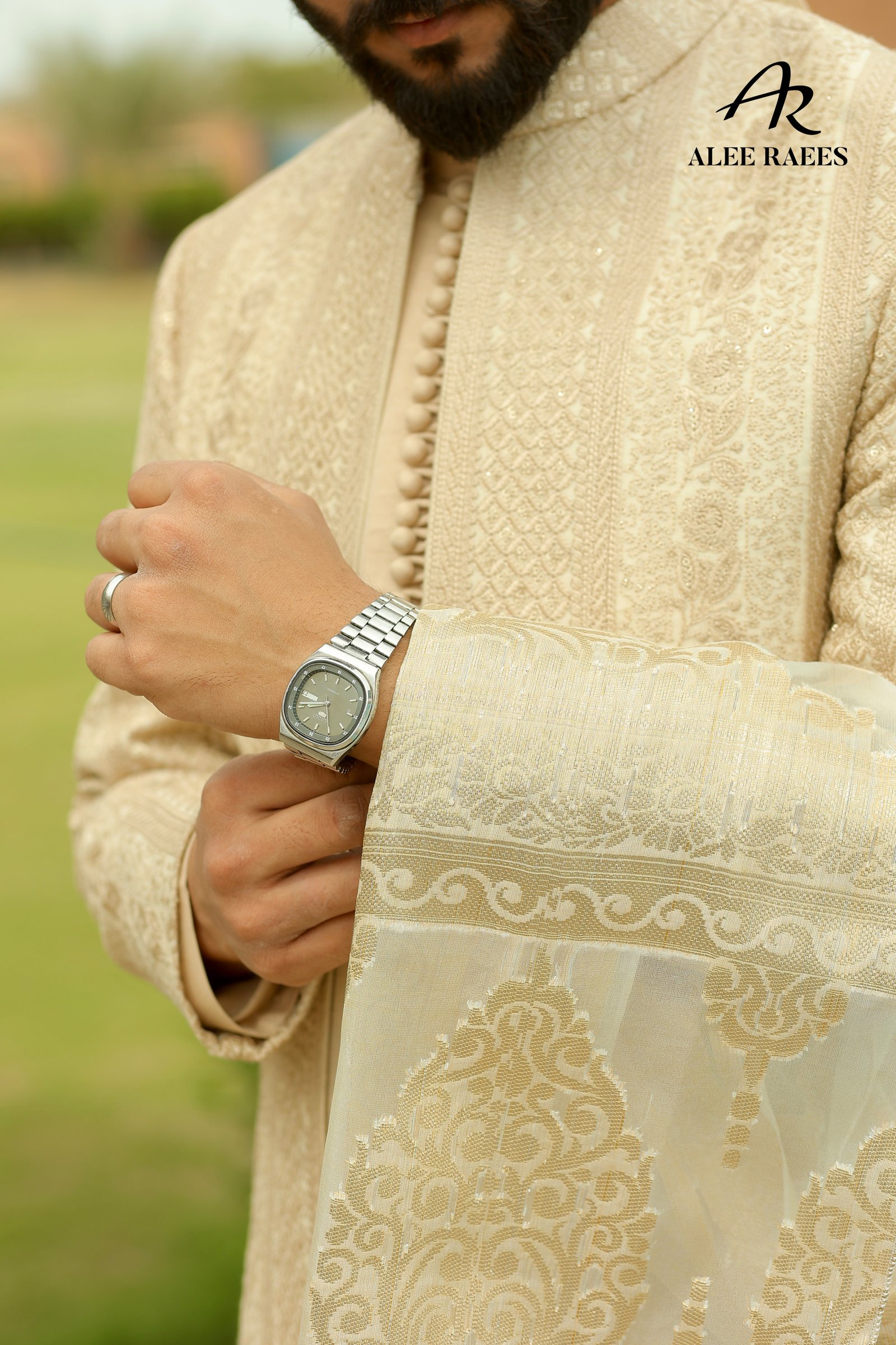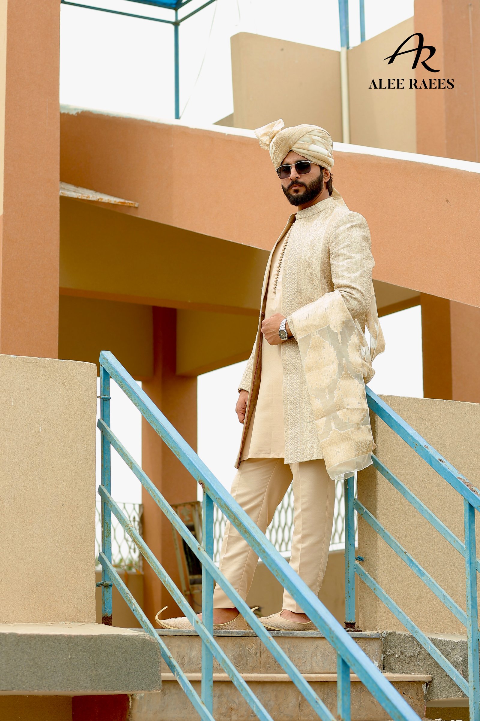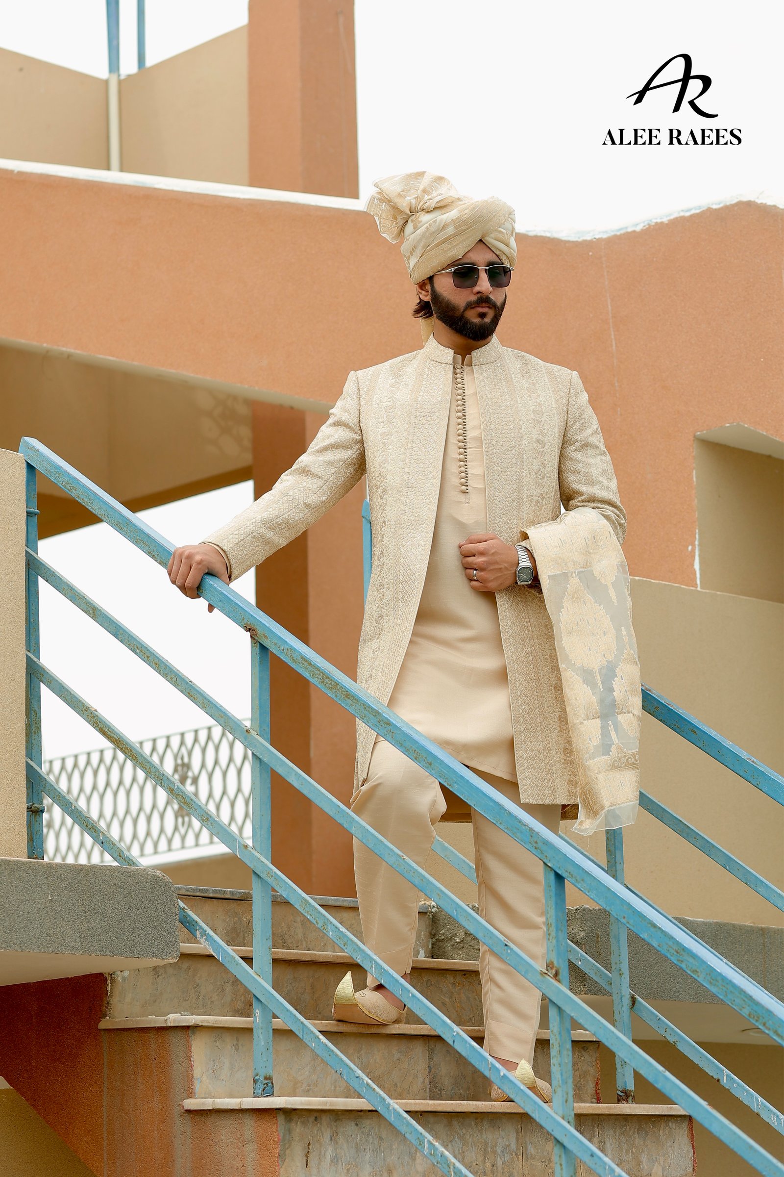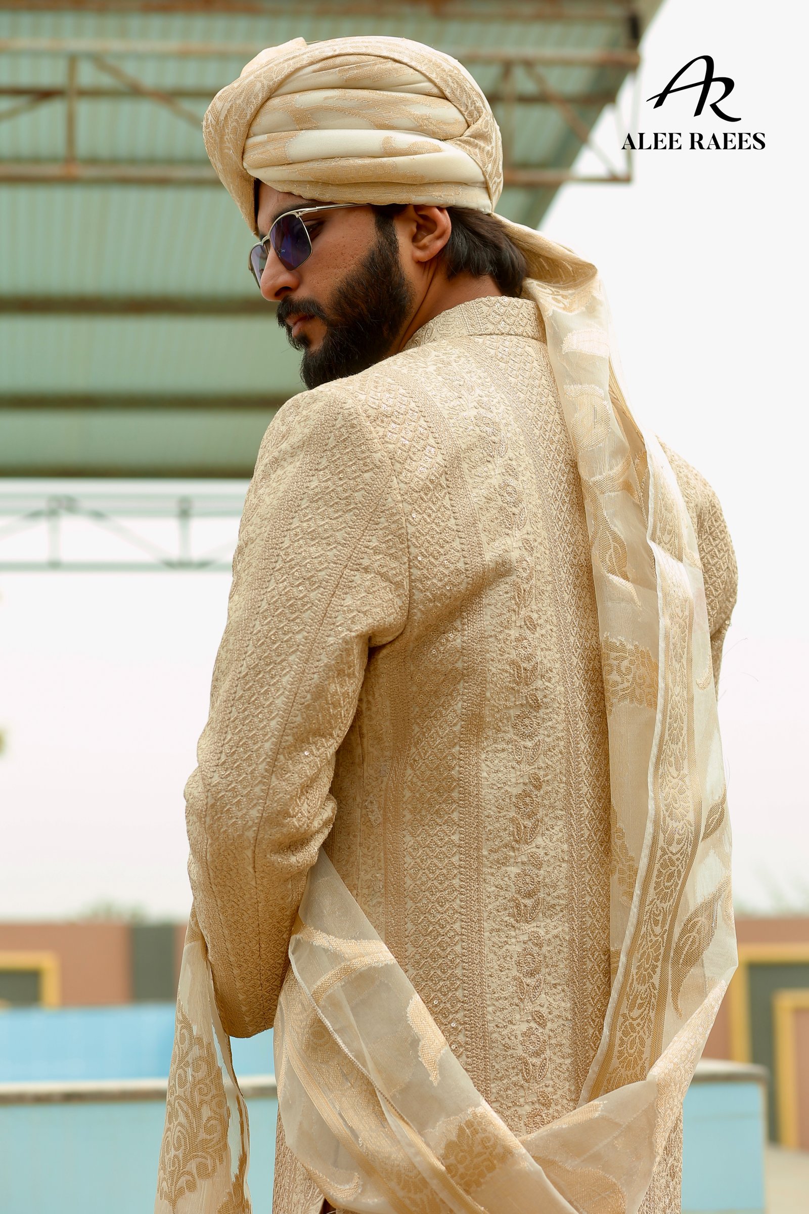 Step into a world of classic sophistication with this exquisitely crafted light gold sherwani, this ensemble perfectly harmonizes tradition and style. It is ideal for grooms and men of taste who want to leave an unforgettable impression on their big day.