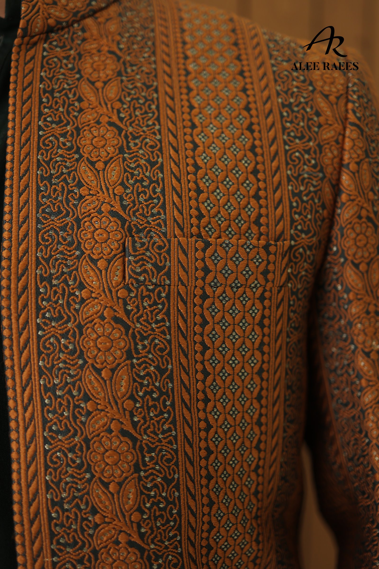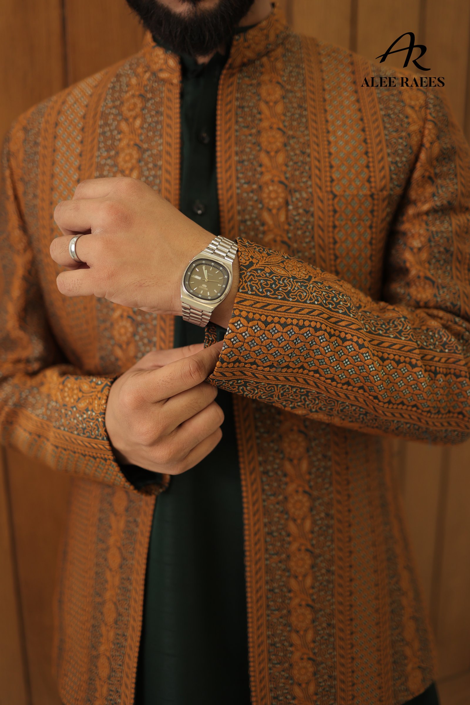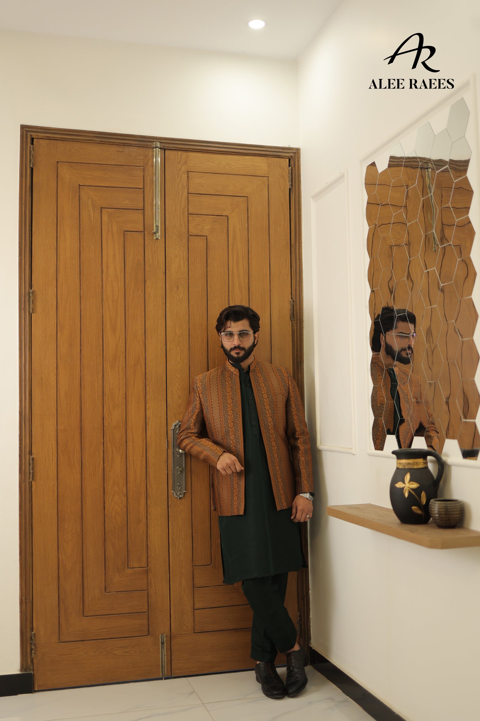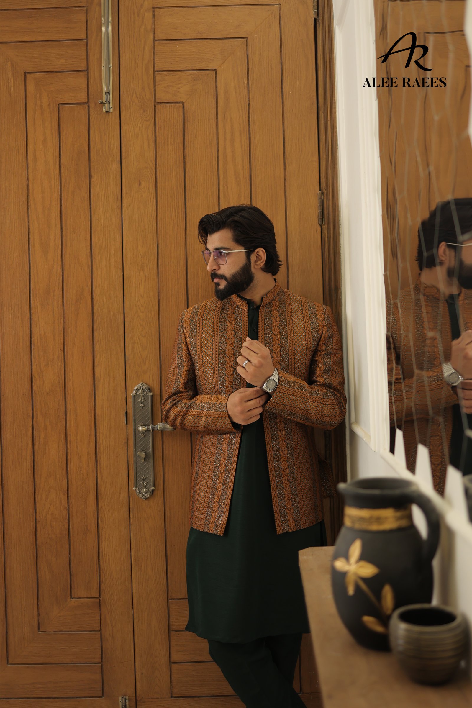 This copper-colored, embroidered waistcoat with zari work is paired with a dark green kurta pajama, making it the perfect choice for mehndi nights, festive evenings, or standing out in tradition.