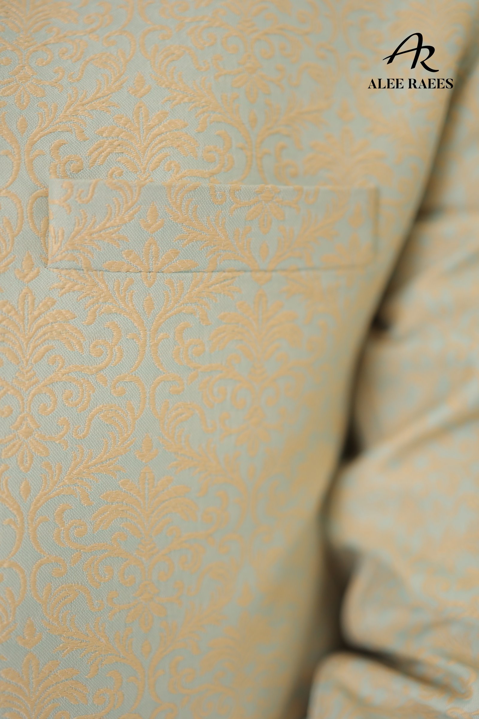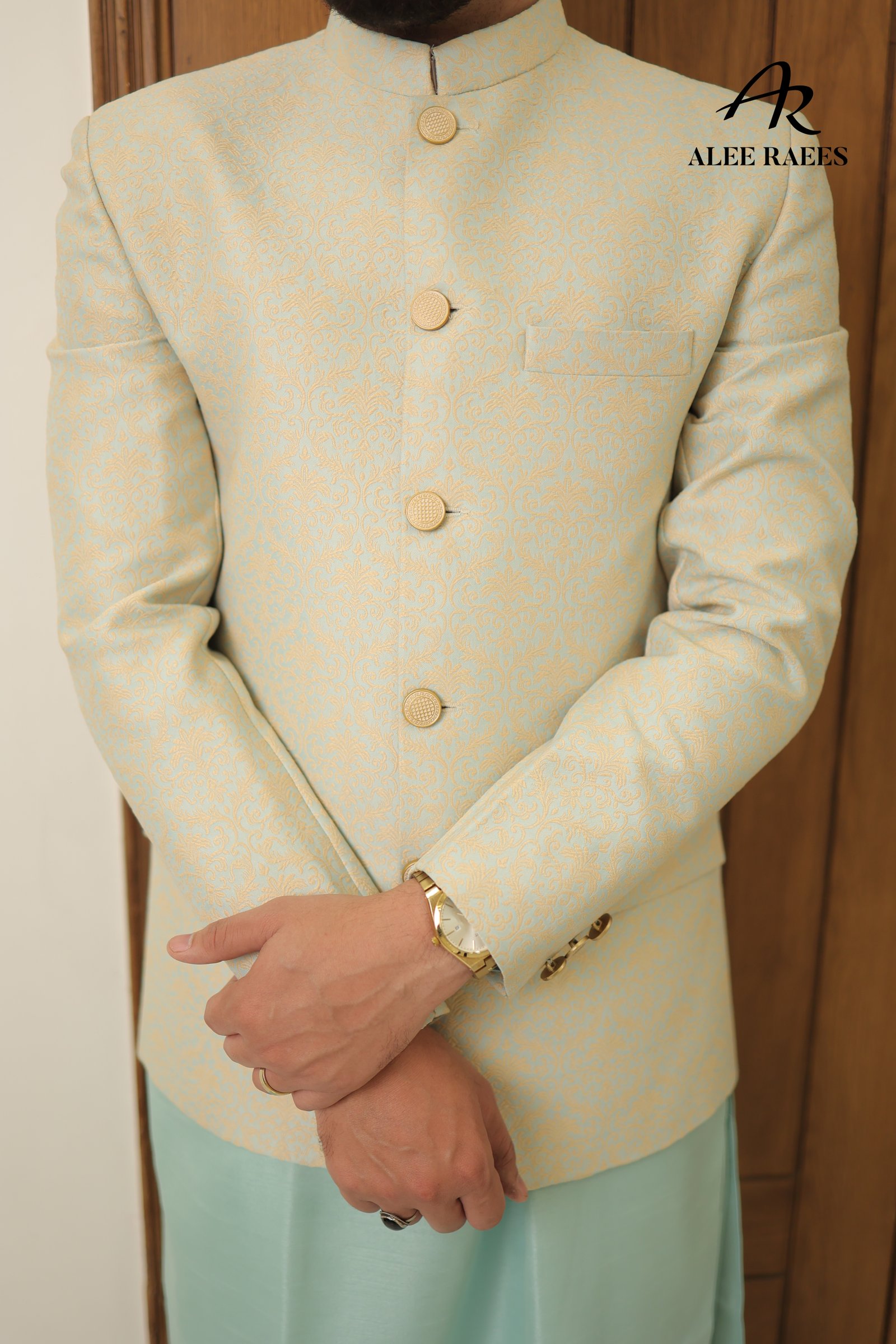 Stand out in our soft pistachio green kurta shalwar paired with a cream-colored jacquard prince coat—perfect for day weddings, mehndi events, or Eid celebrations. Crafted for style and elegance with a subtle golden touch to the coat’s texture.